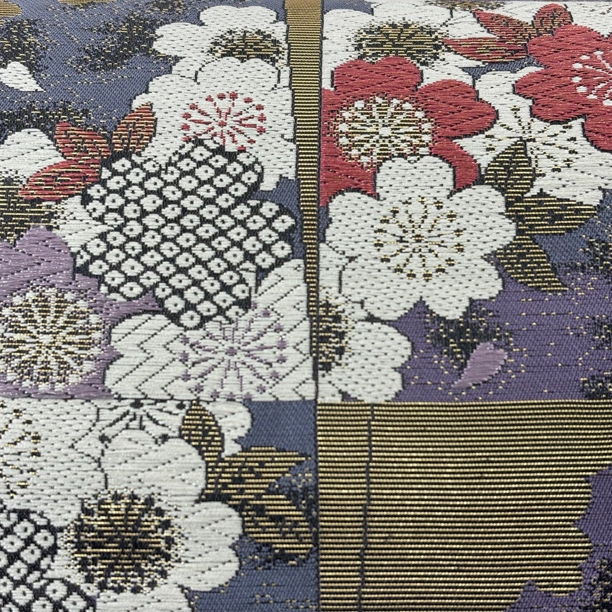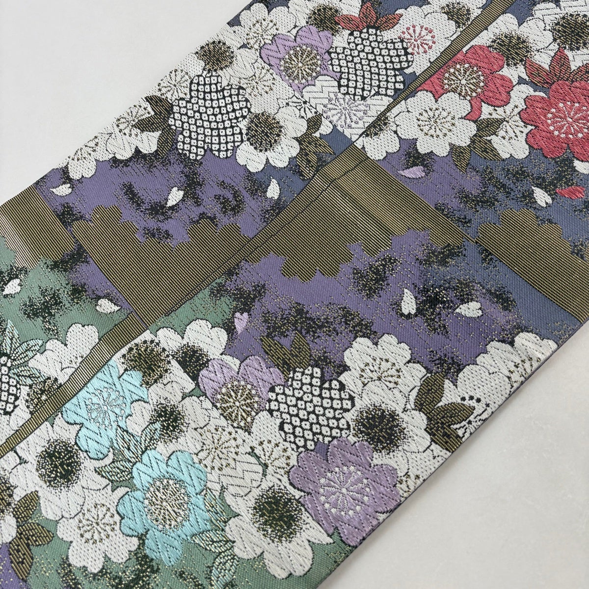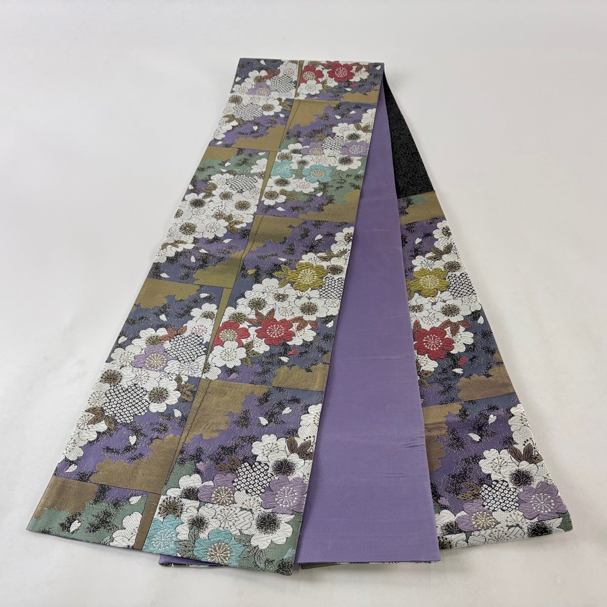 袋帯 秀品 振袖向き 桜 幾何学 金糸 ラメ 青紫 六通 正絹