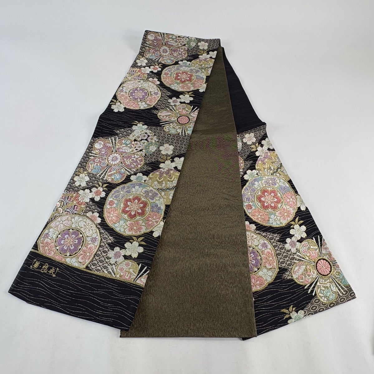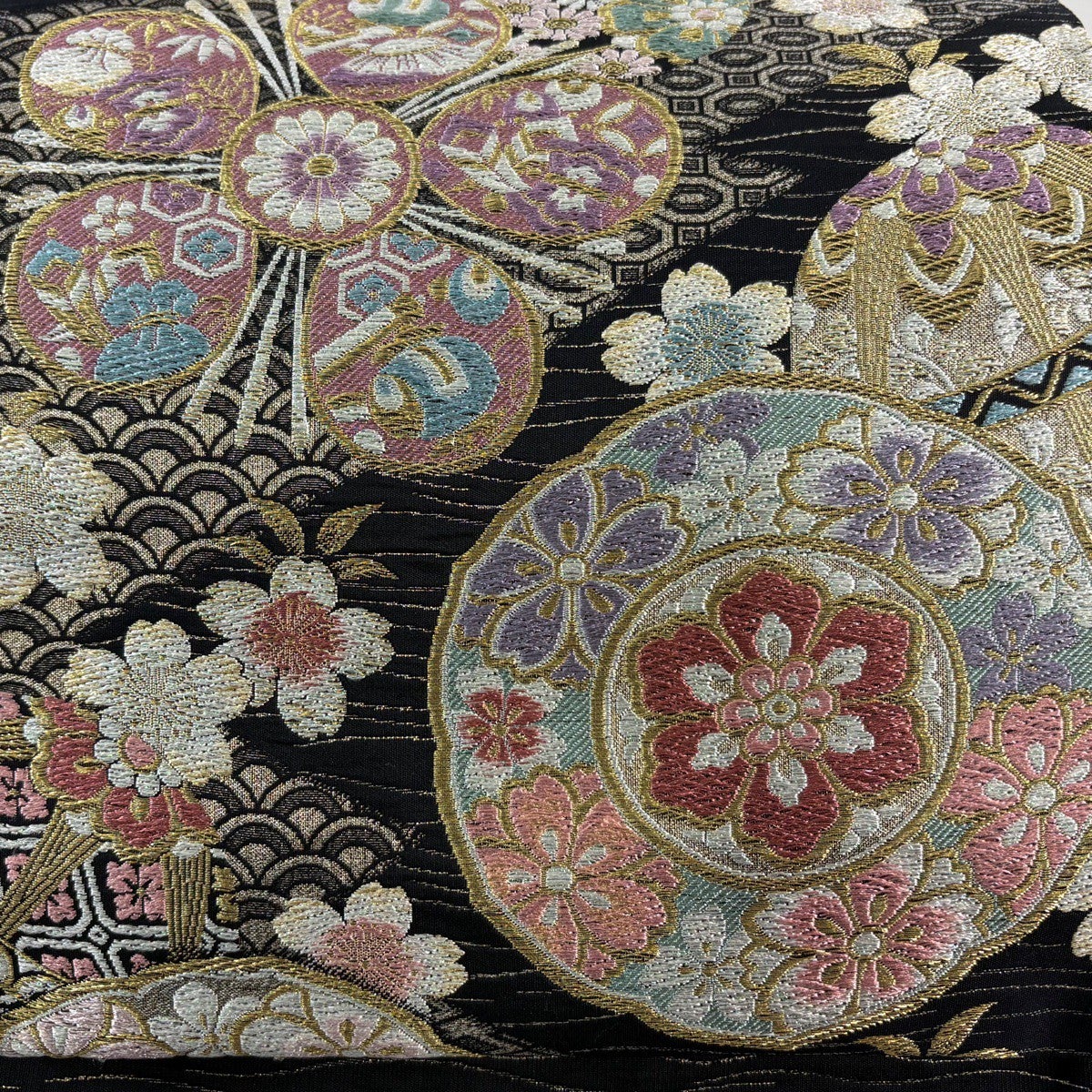 【美品】 袋帯 秀品 証紙あり 手鞠 桜 金糸 箔 黒 六通 正絹