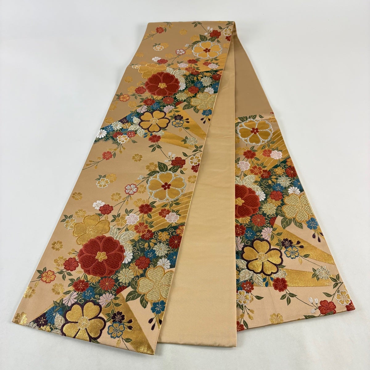 【美品】 袋帯 秀品 草花 桜 金糸 箔 薄オレンジ 六通 正絹