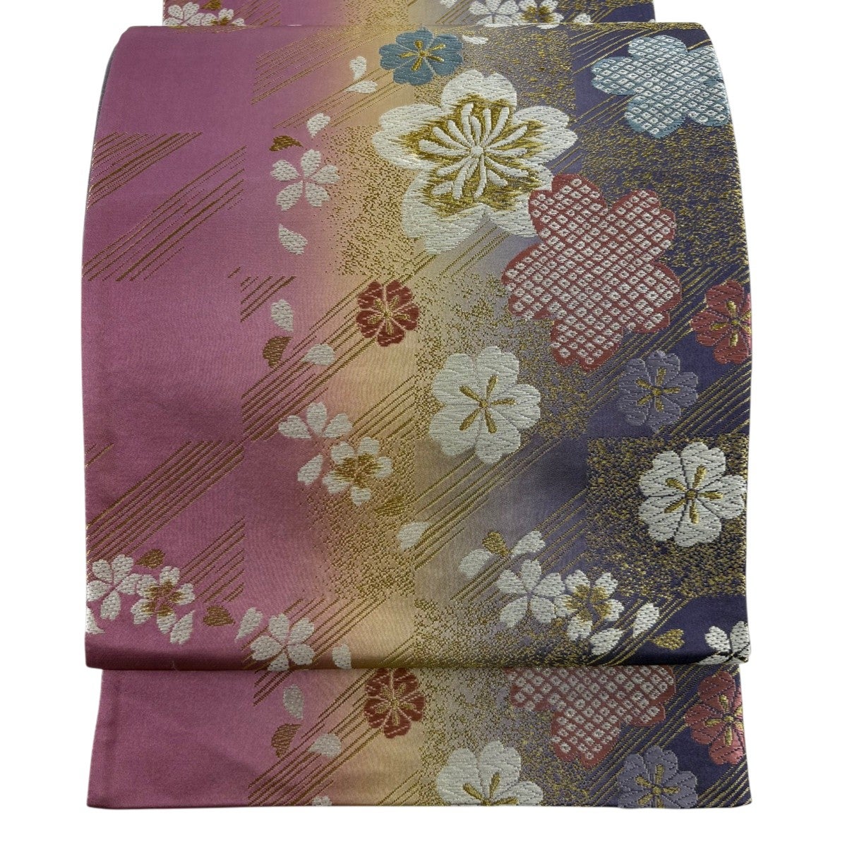 袋帯 優品 桜 斜縞 金糸 箔 金色 六通 化繊