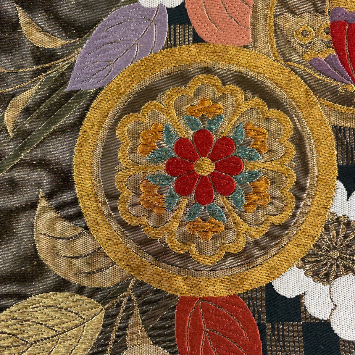 袋帯 秀品 桜 草花 金糸 箔 黒 六通 正絹