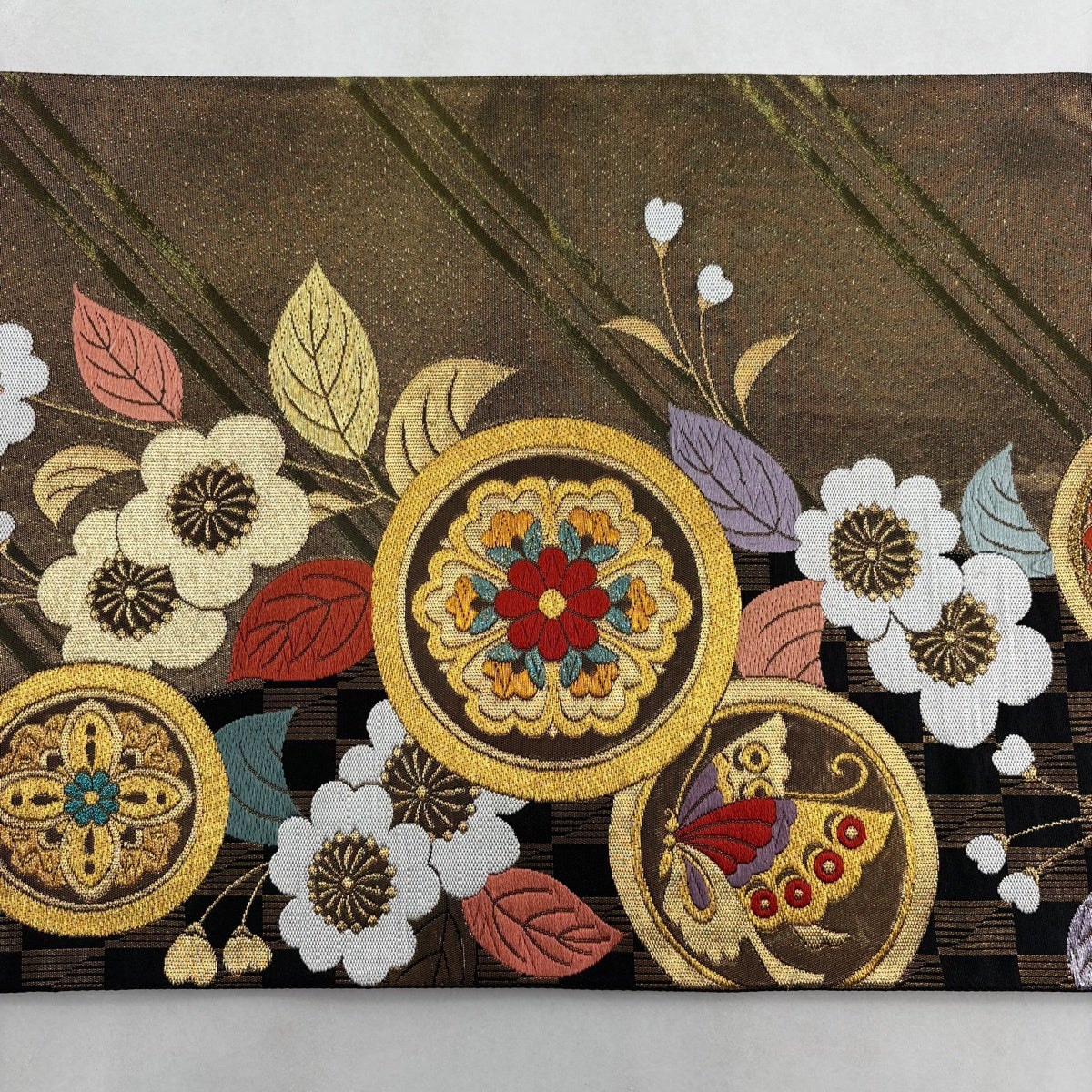 袋帯 秀品 蝶 桜 唐織 箔 赤茶 六通 正絹