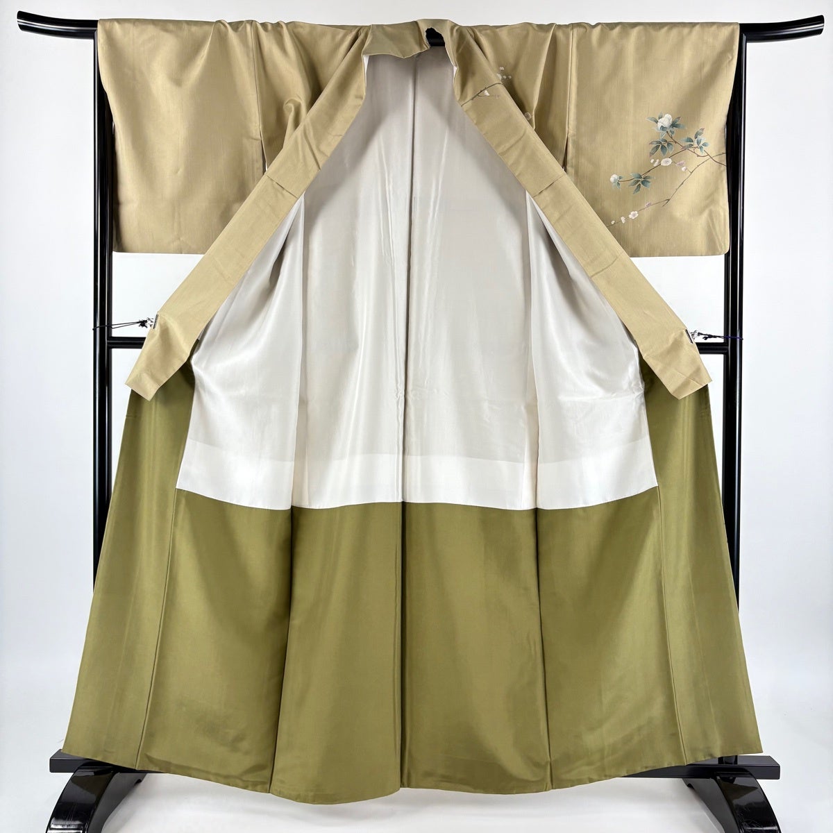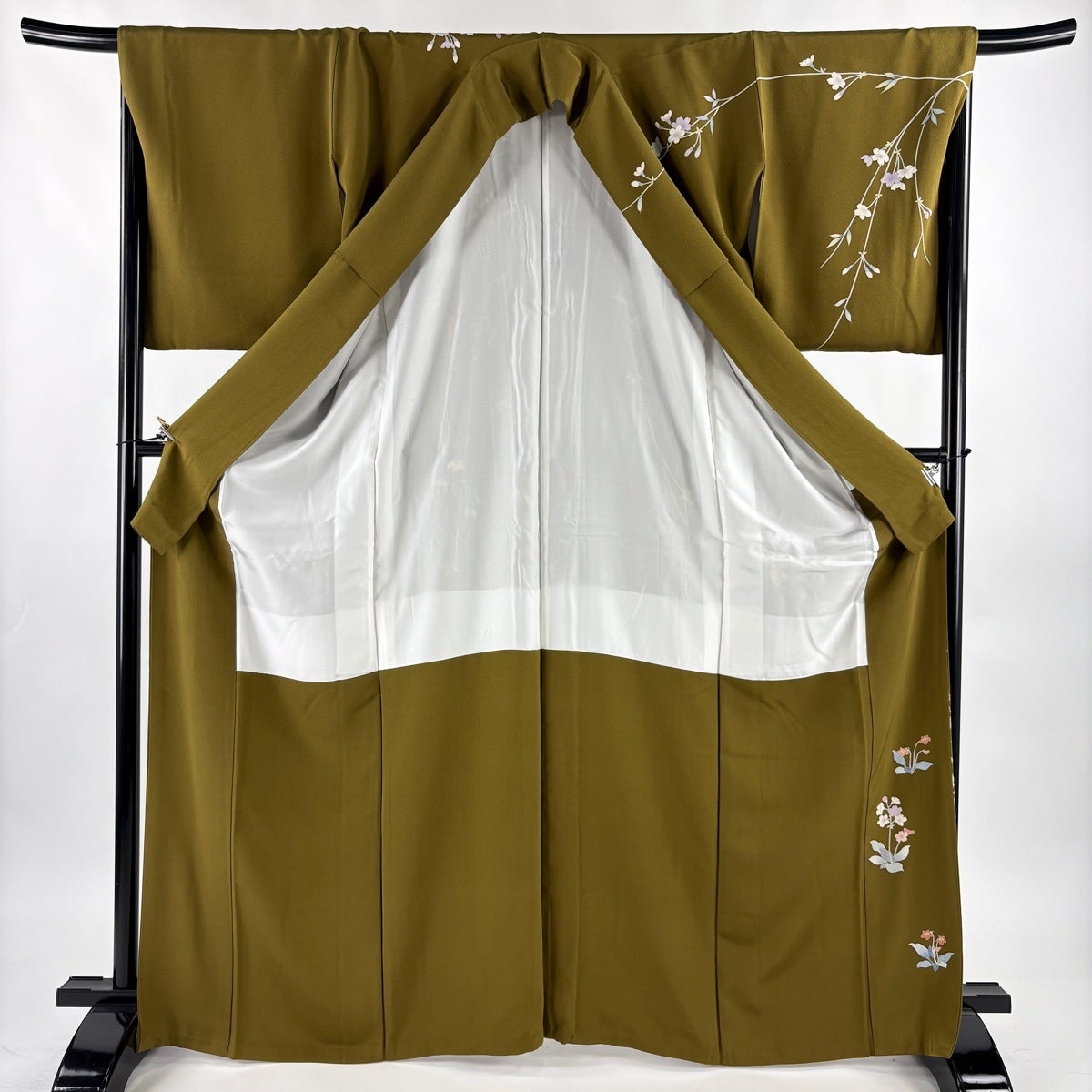 【美品】 訪問着 身丈160cm 裄丈66.5cm M 袷 桜 刺繍 金彩 茶緑色 正絹 名品