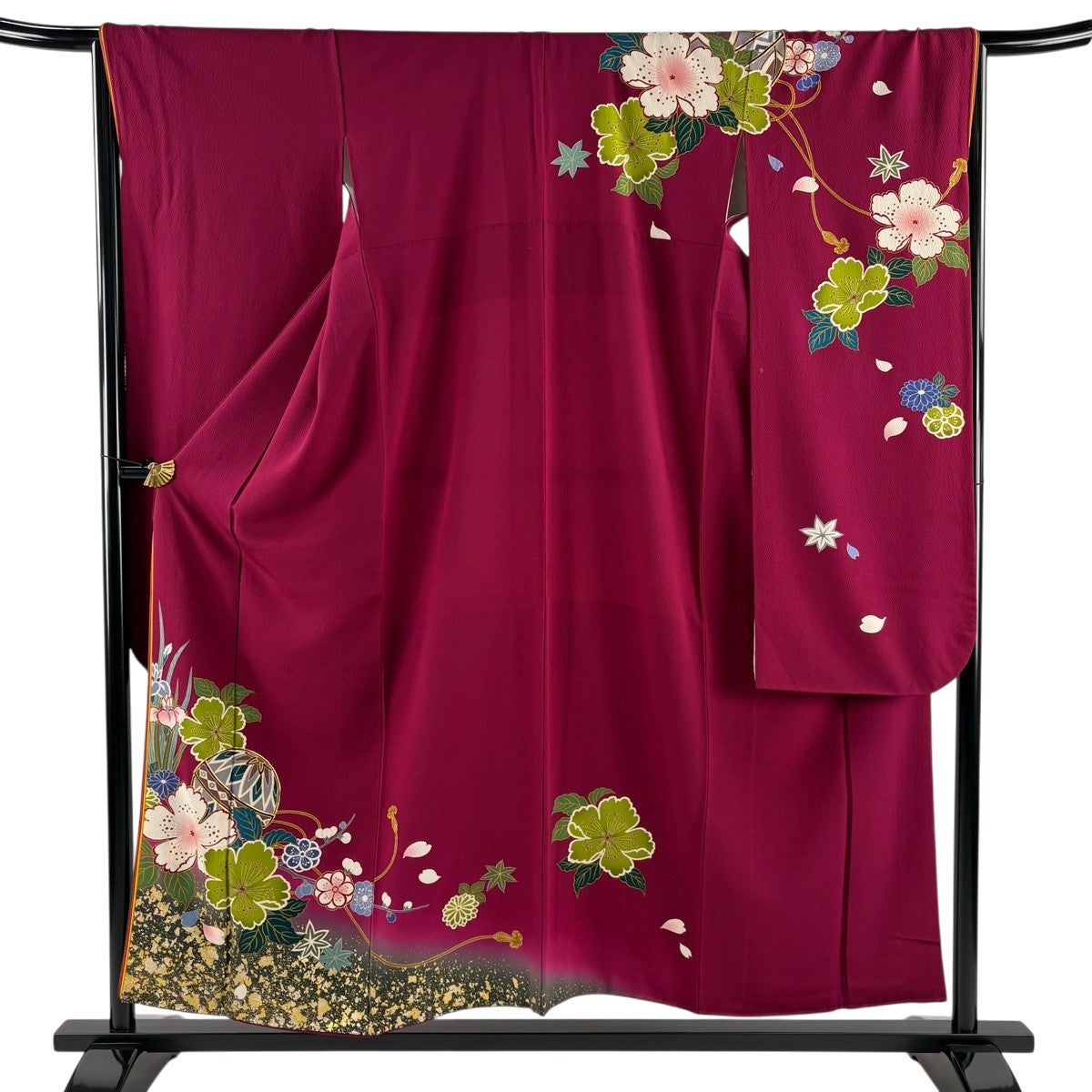 振袖 身丈167cm 裄丈67cm M 袷 落款あり 御所車 桜 金糸 金銀彩 ピンク 正絹 秀品