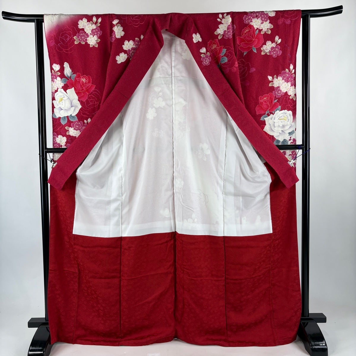 【美品】 振袖 身丈160cm 裄丈66cm M 袷 落款あり 桜 菊 金糸 絞り えんじ色 正絹 秀品