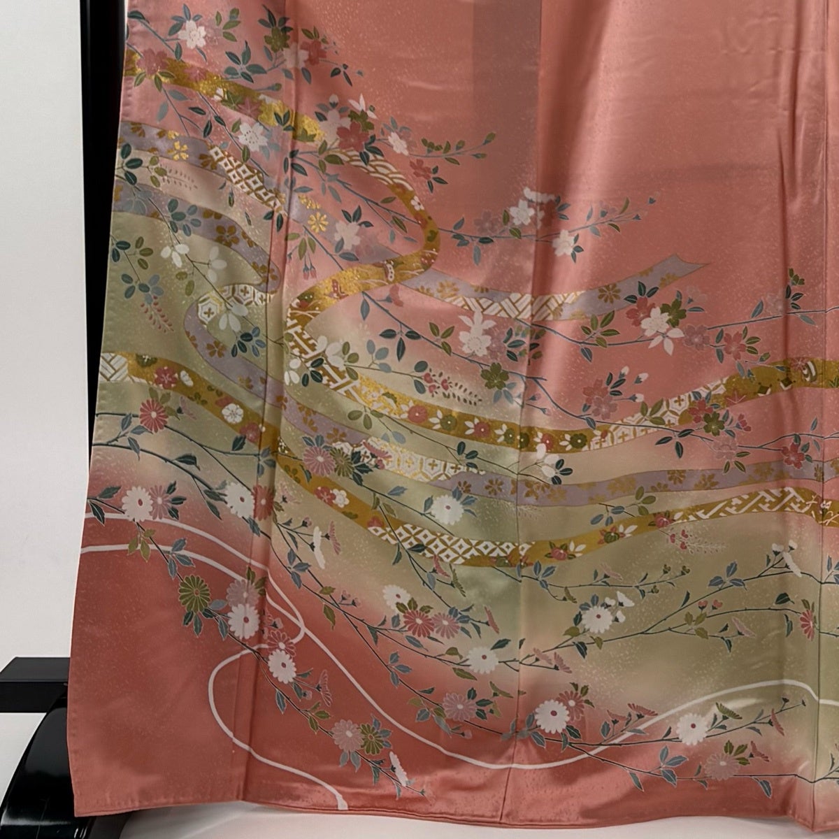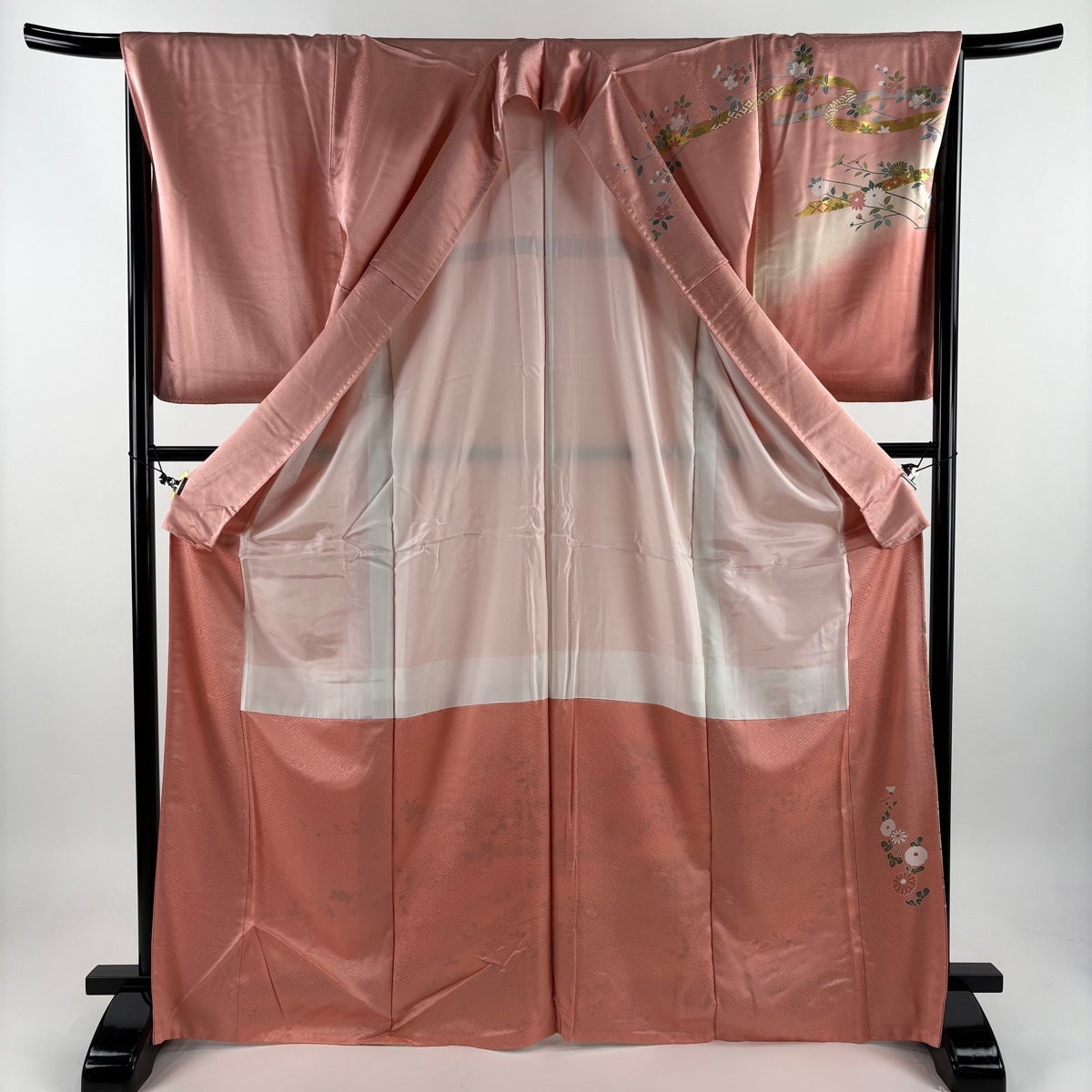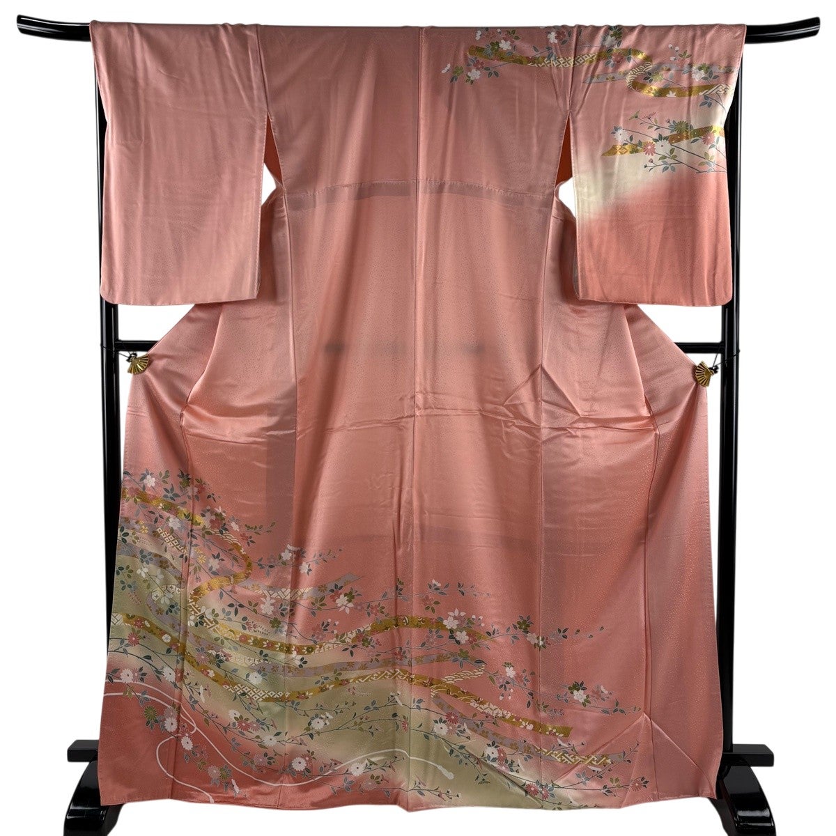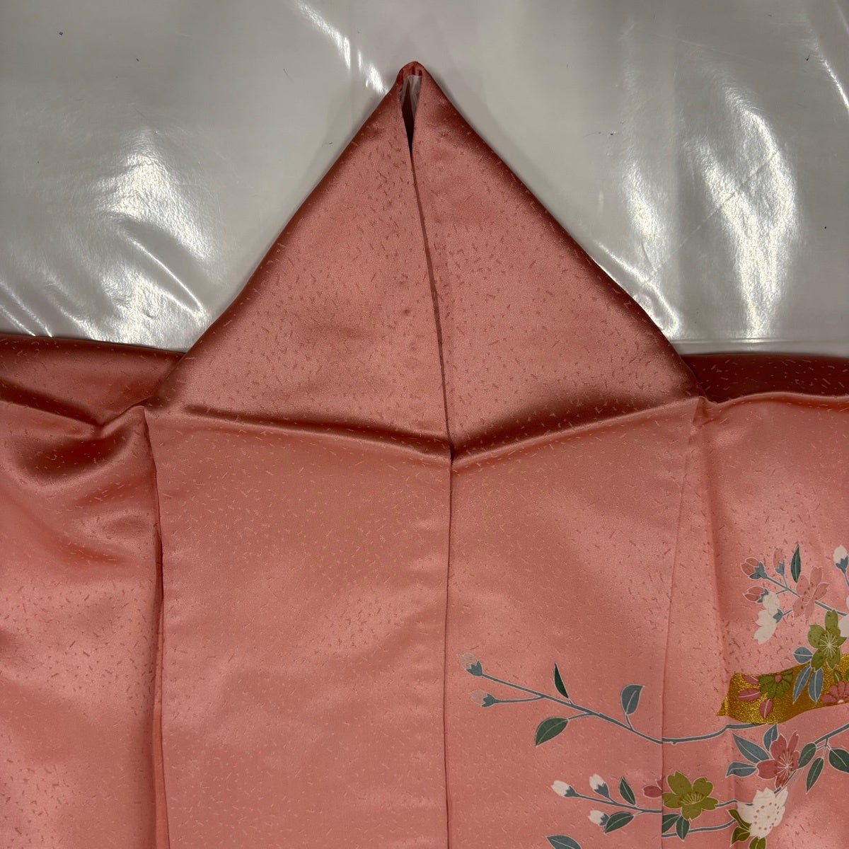 訪問着 身丈167.5cm 裄丈68cm L 袷 桜 若松 金銀彩 ぼかし サーモンピンク 正絹 秀品