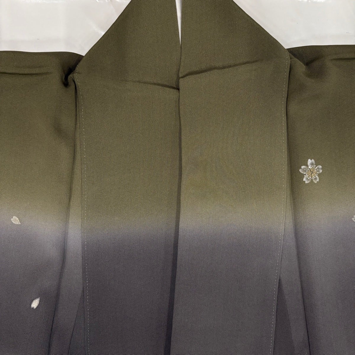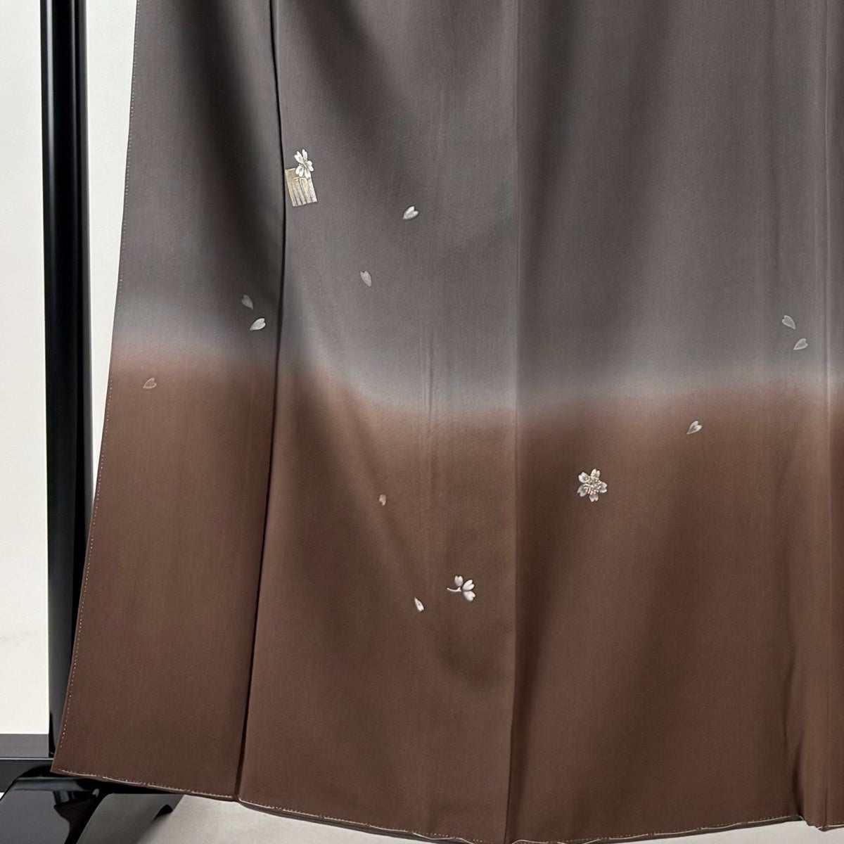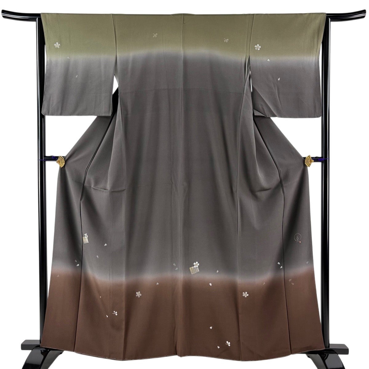 訪問着 身丈160.5cm 裄丈66.5cm M 単衣 落款あり 桜 草花 ぼかし 灰茶 正絹 名品 一つ紋