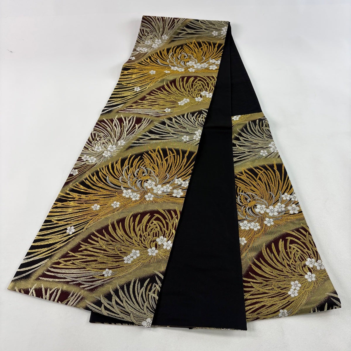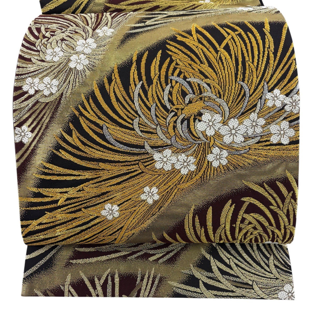 袋帯 秀品 菊 桜 金糸 刺繍 茶色 六通 正絹