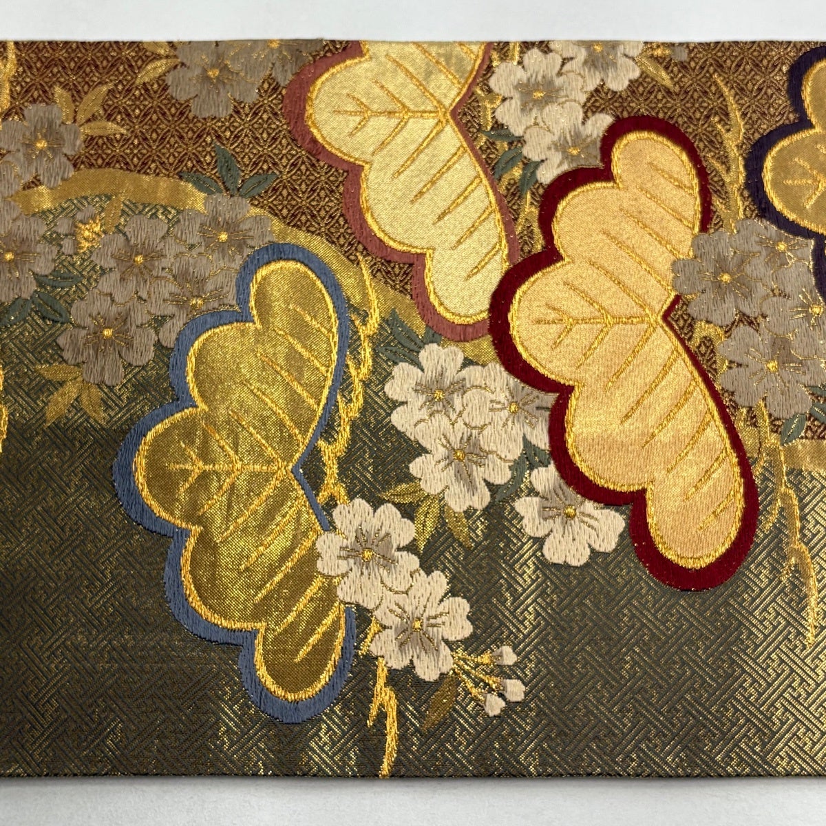 袋帯 秀品 熨斗 桜 金銀糸 箔 金茶 六通 正絹