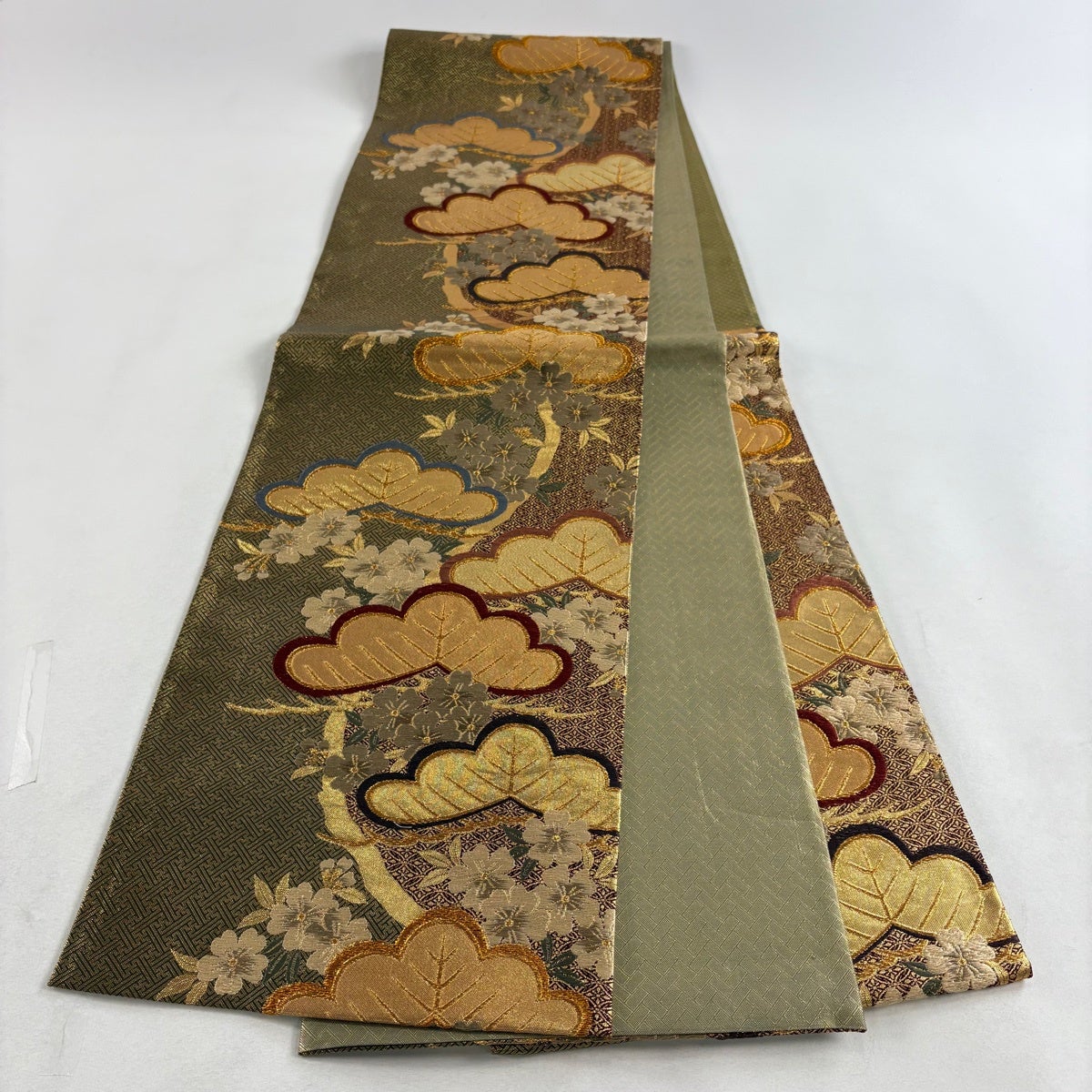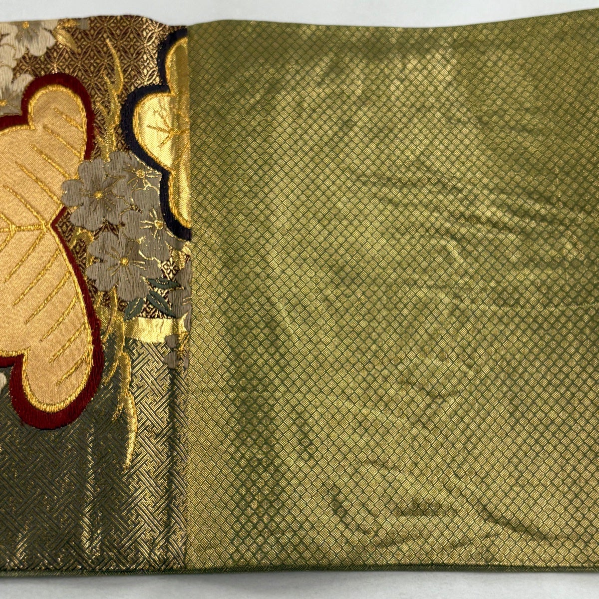 袋帯 秀品 桜 草花 金銀糸 箔 緑 六通 正絹