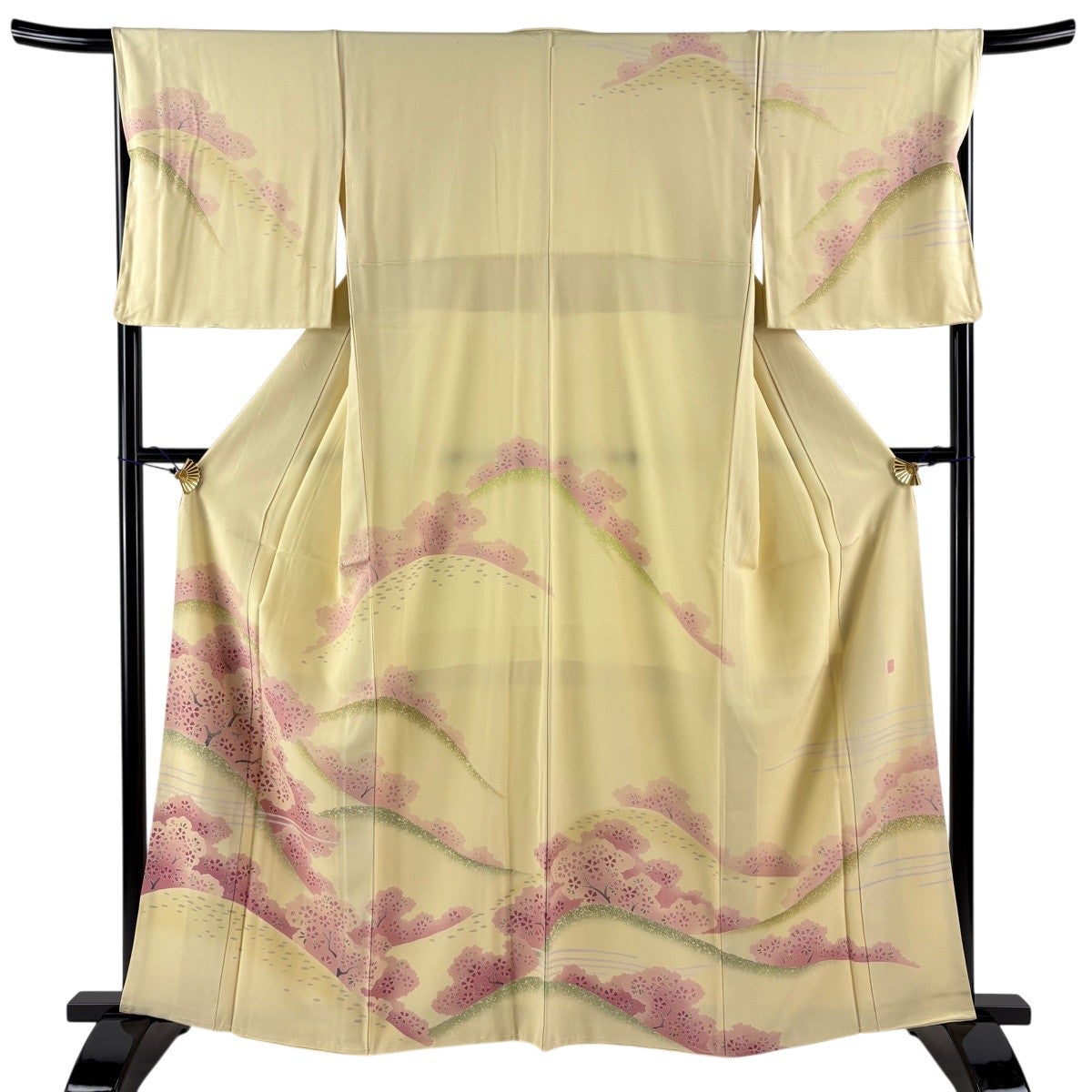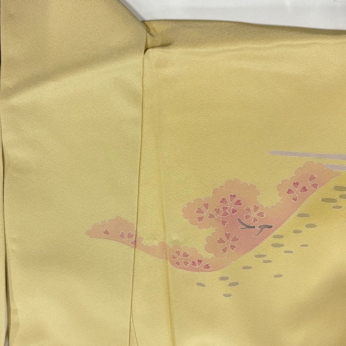 訪問着 身丈161cm 裄丈65.5cm M 単衣 落款あり 桜 滝 染め分け ぼかし ピンクベージュ 正絹 秀品 一つ紋