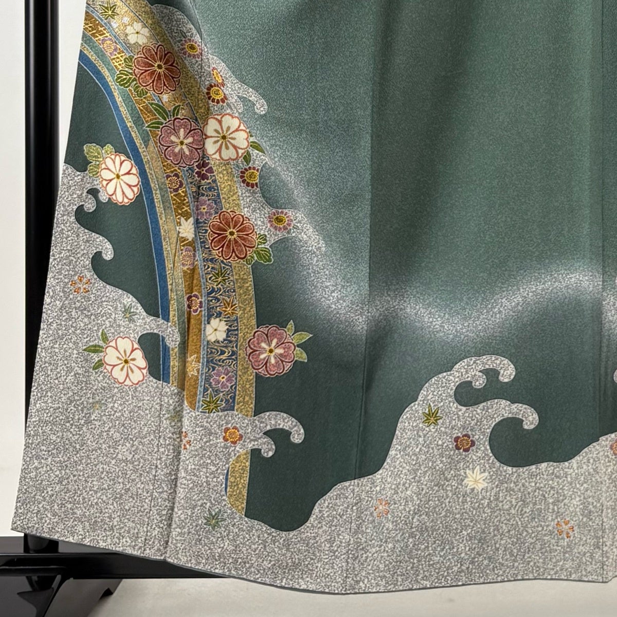 【美品】 袋帯 名品 関西仕立て 桜楓 波 箔 金彩 灰緑 お太鼓柄 正絹