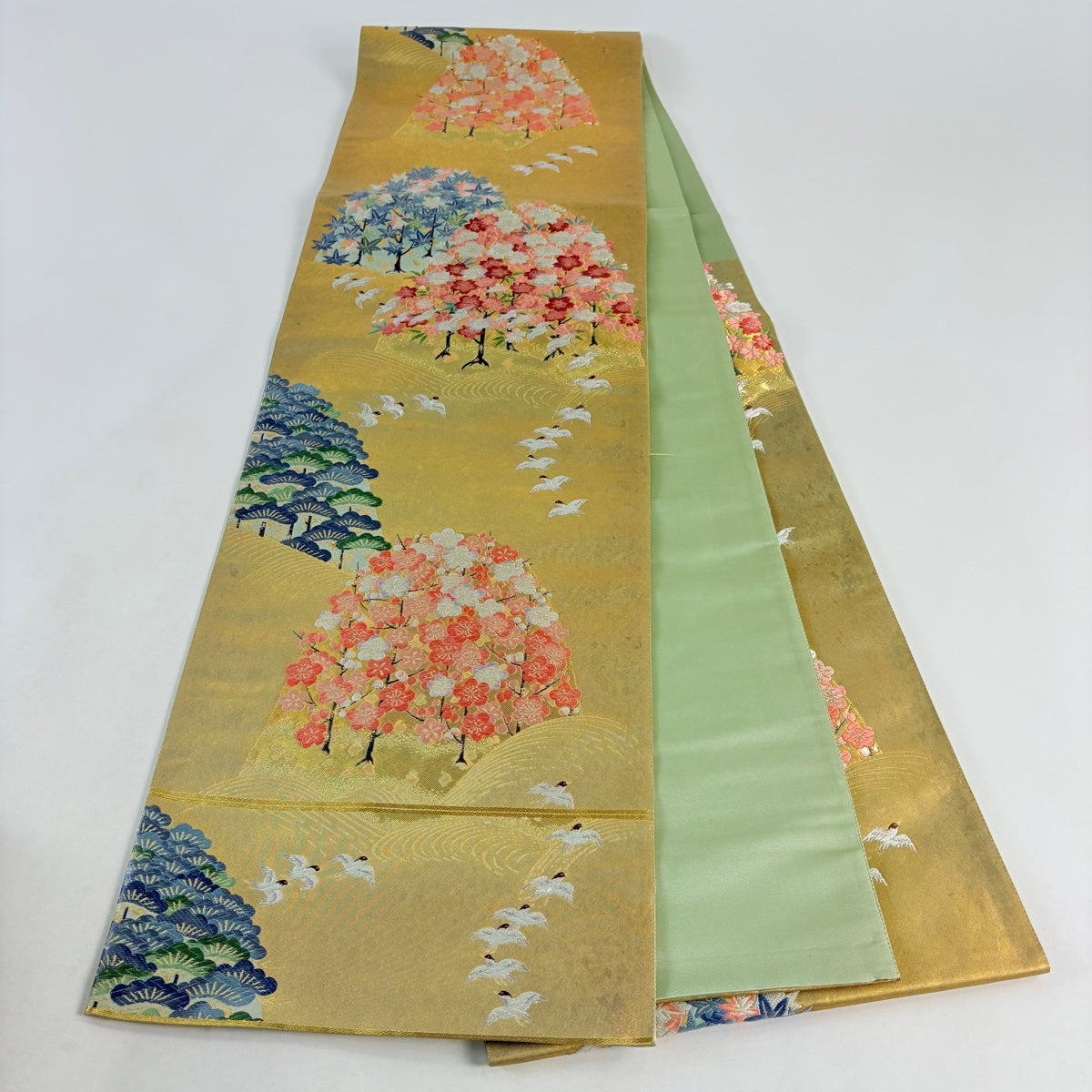袋帯 秀品 振袖向き 熨斗 桜 金糸 箔 緑 六通 正絹