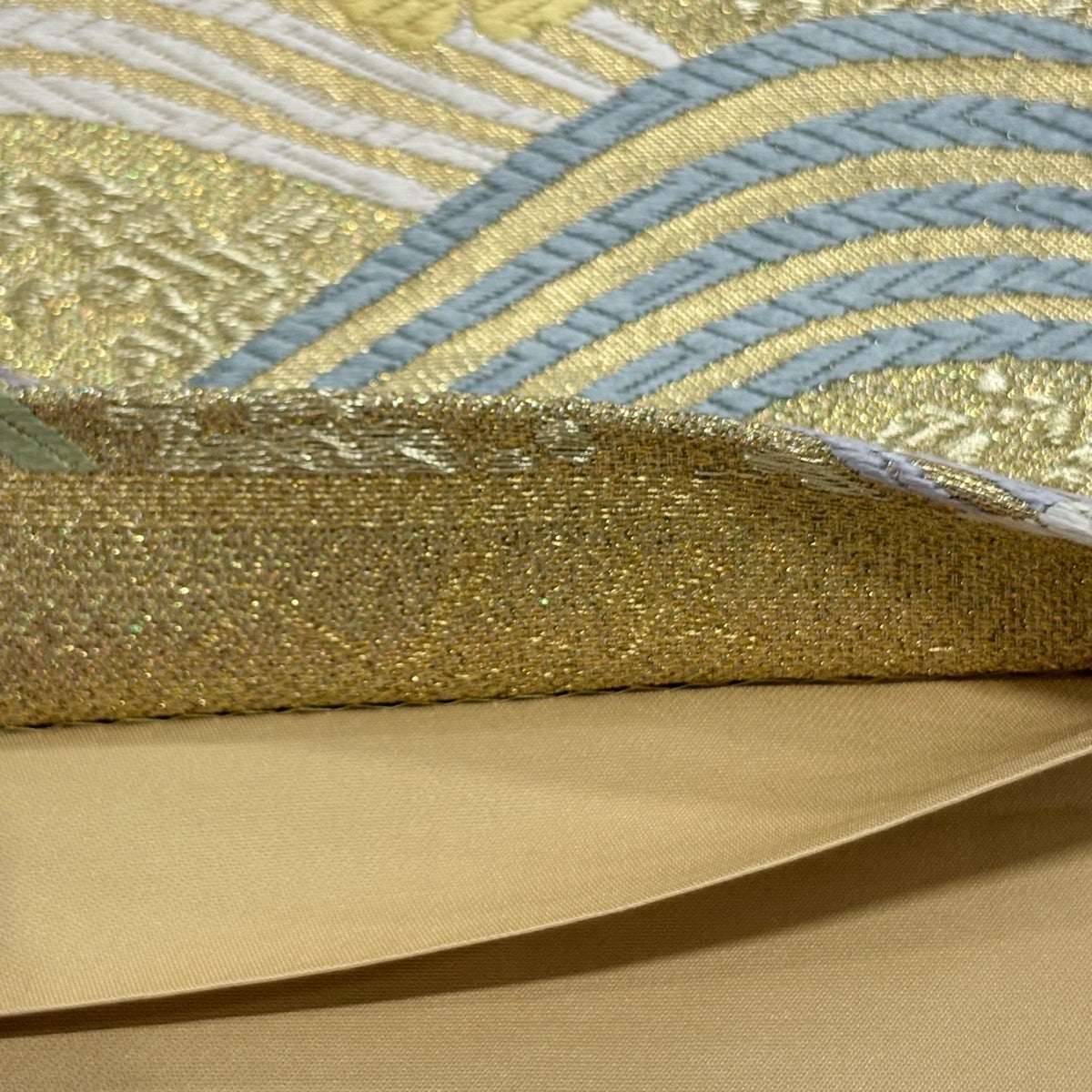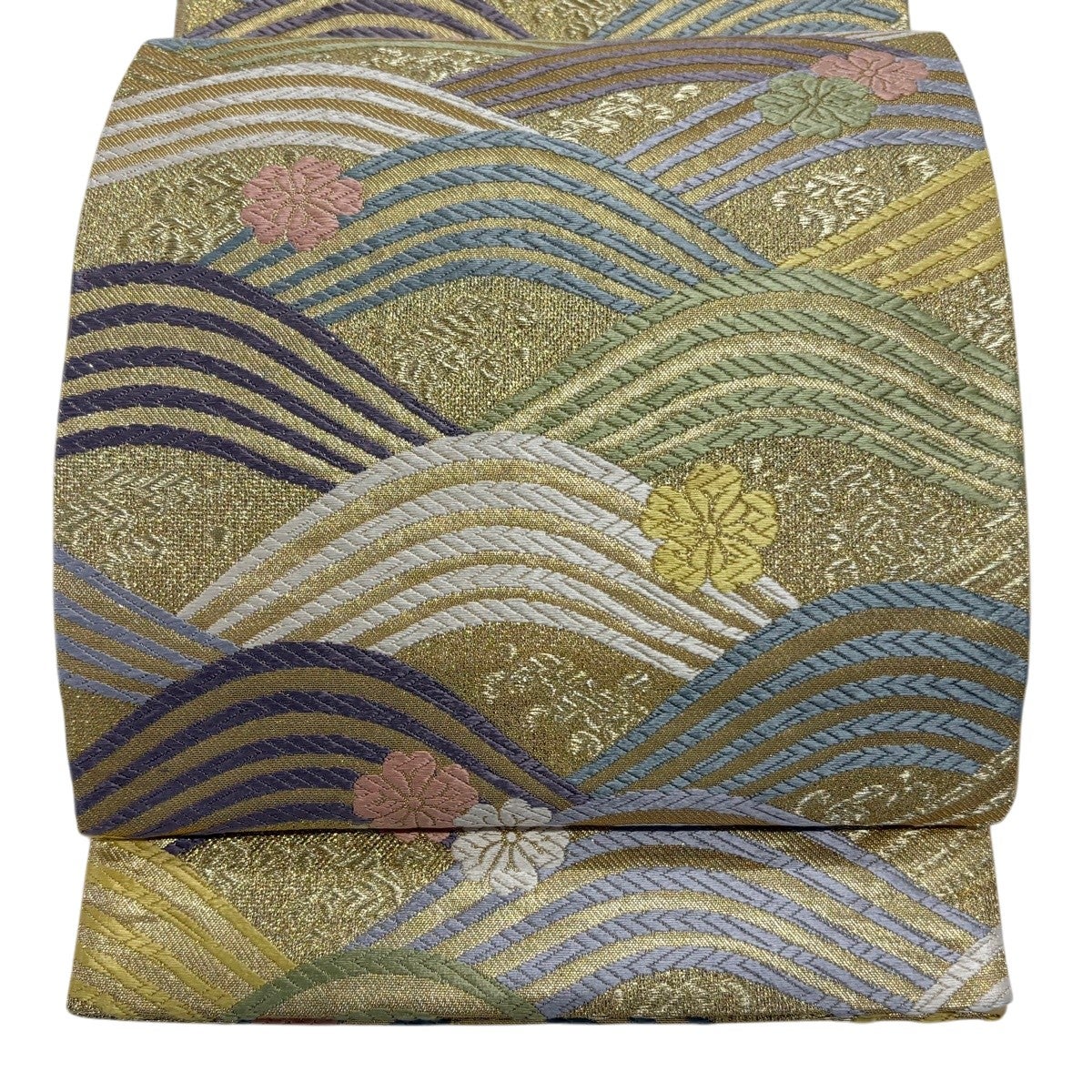 【美品】 袋帯 秀品 桜 波 刺繍 金糸 金色 六通 正絹