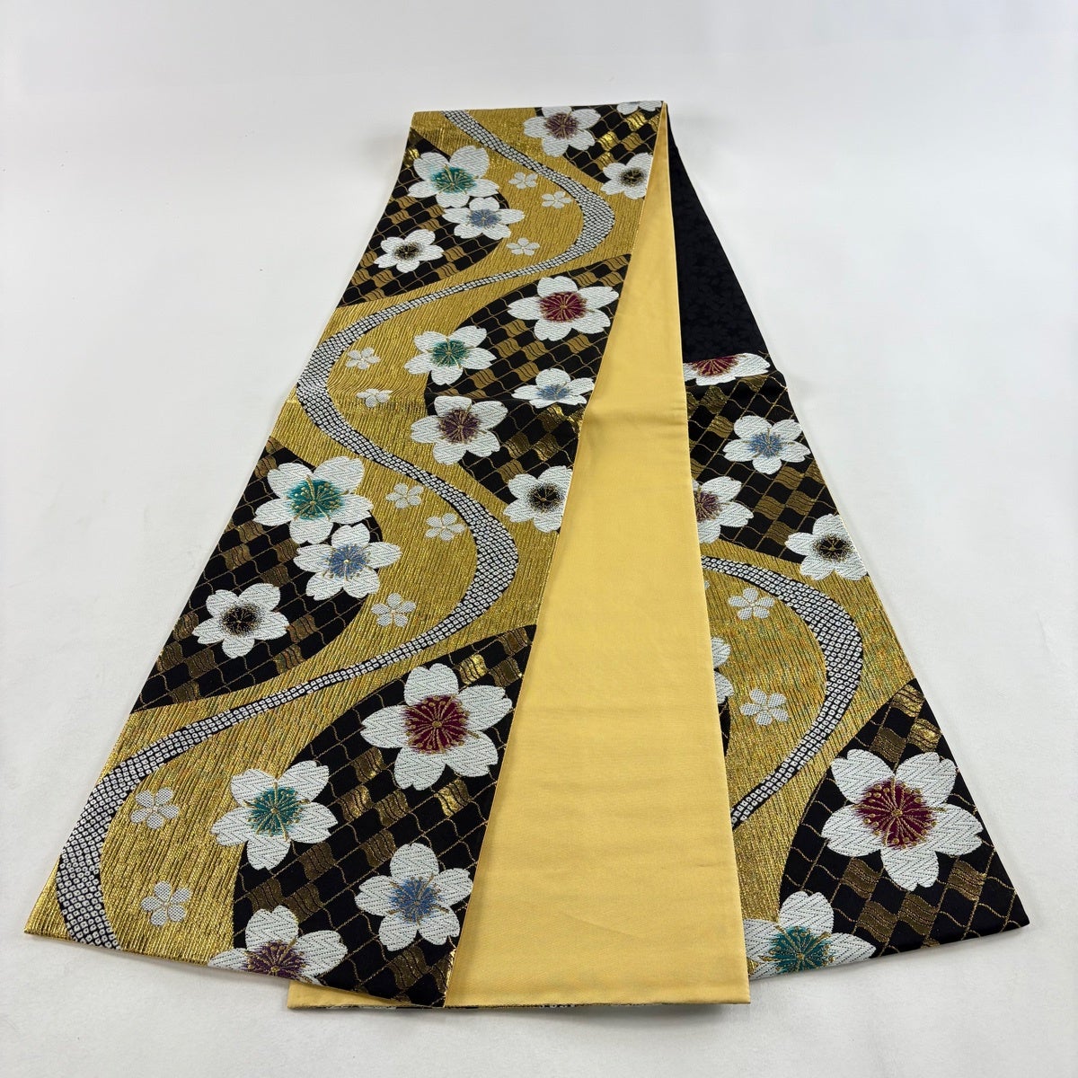 袋帯 秀品 振袖向き 桜 流水 金糸 箔 金色 六通 正絹
