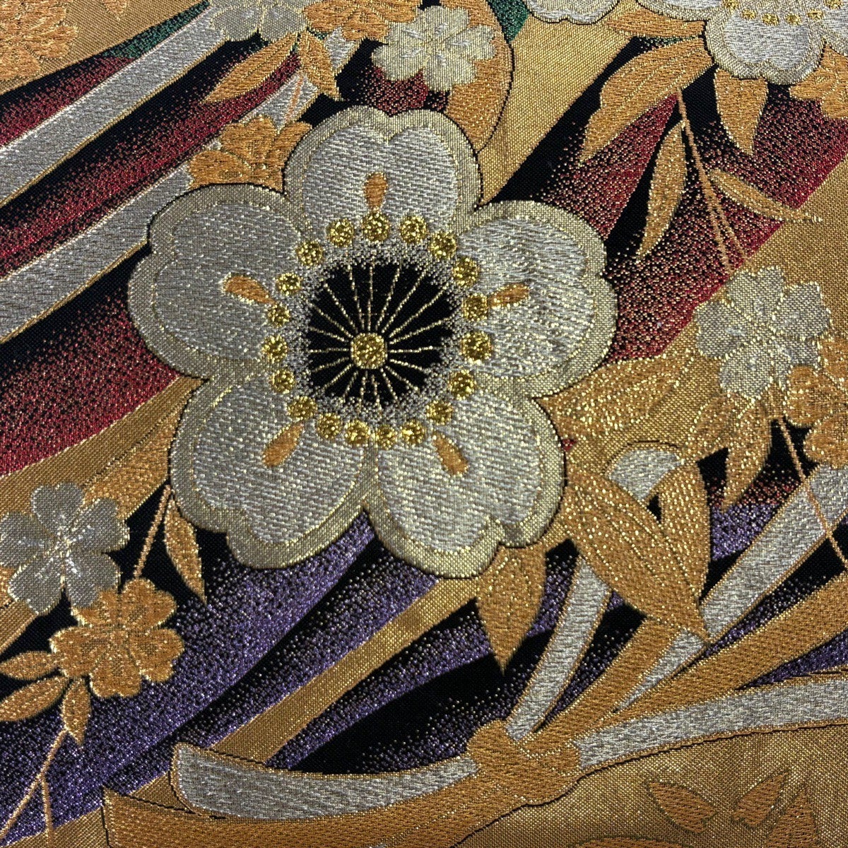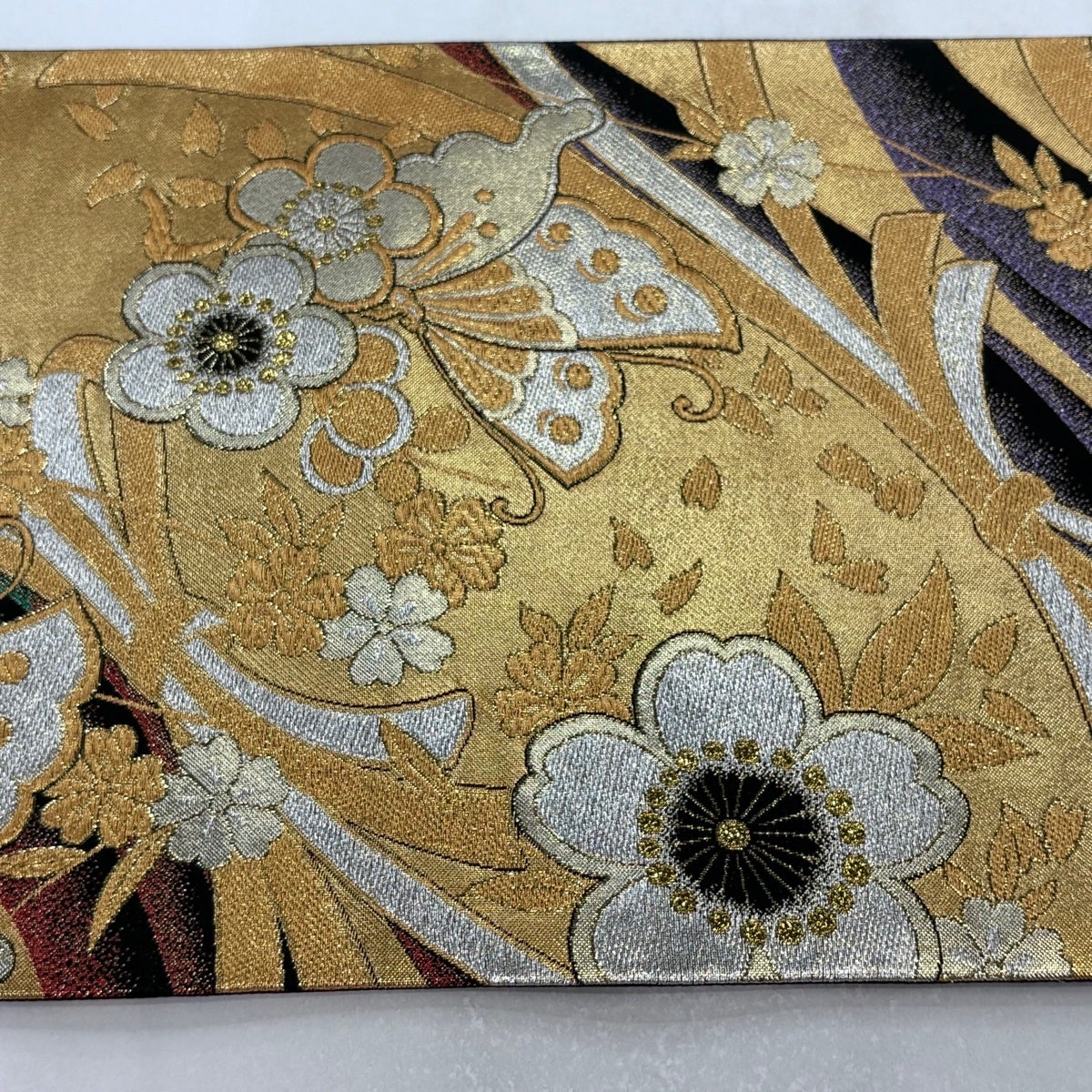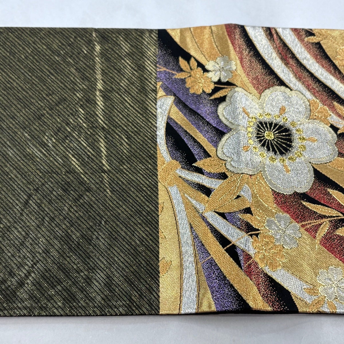 袋帯 秀品 振袖向き 桜 斜縞 金糸 箔 金色 六通 正絹