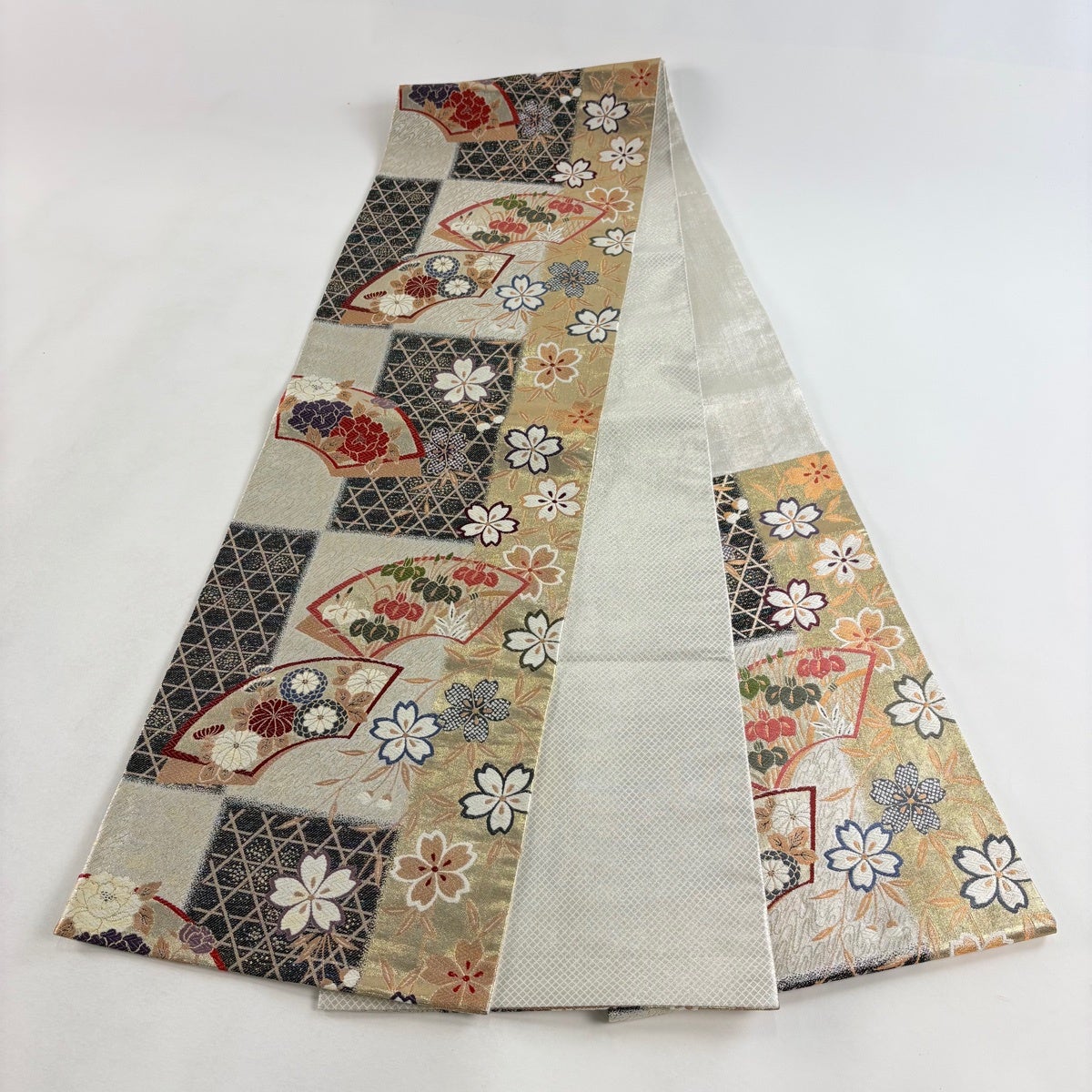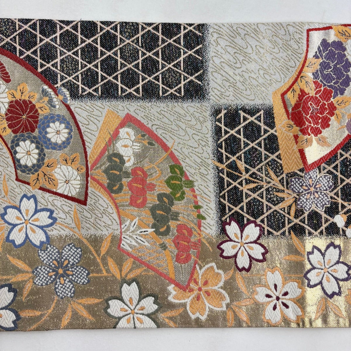 袋帯 秀品 扇面 桜 唐織 箔 ベージュ 六通 正絹