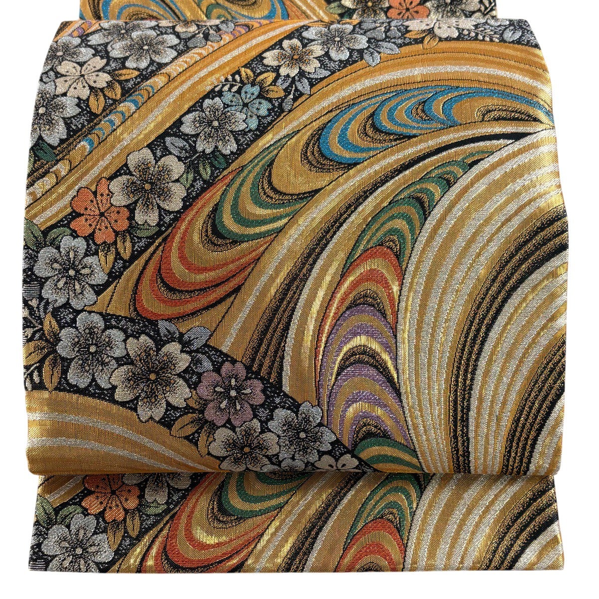 【美品】 袋帯 秀品 桜 流水 金糸 箔 金色 六通 正絹