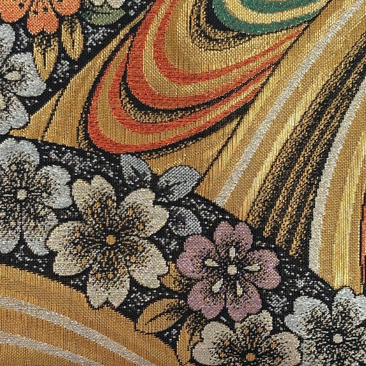 【美品】 袋帯 秀品 扇 桜 唐織 箔 紺色 六通 正絹