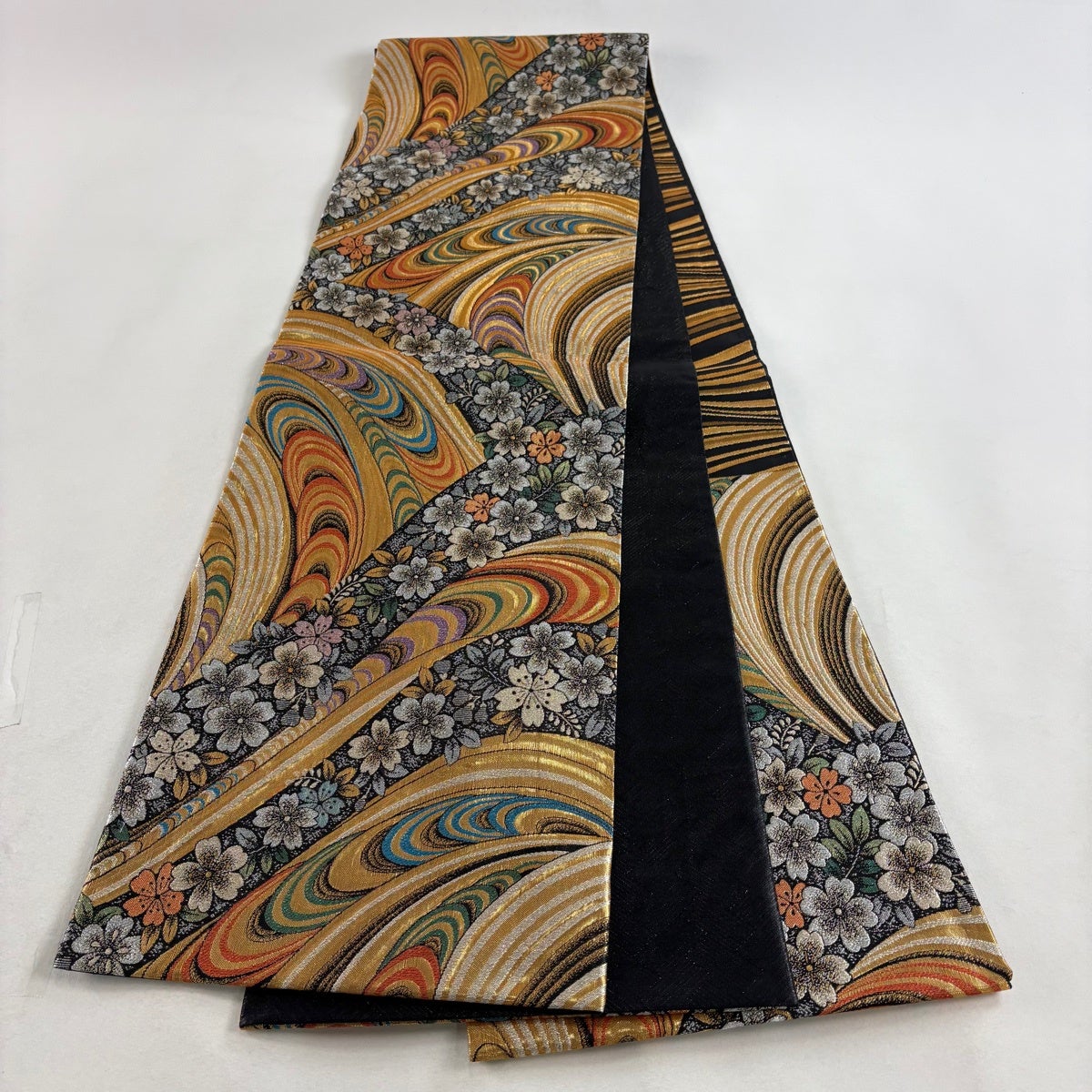 袋帯 秀品 花紅彩 桜 斜縞 唐織 金糸 黒 六通 正絹