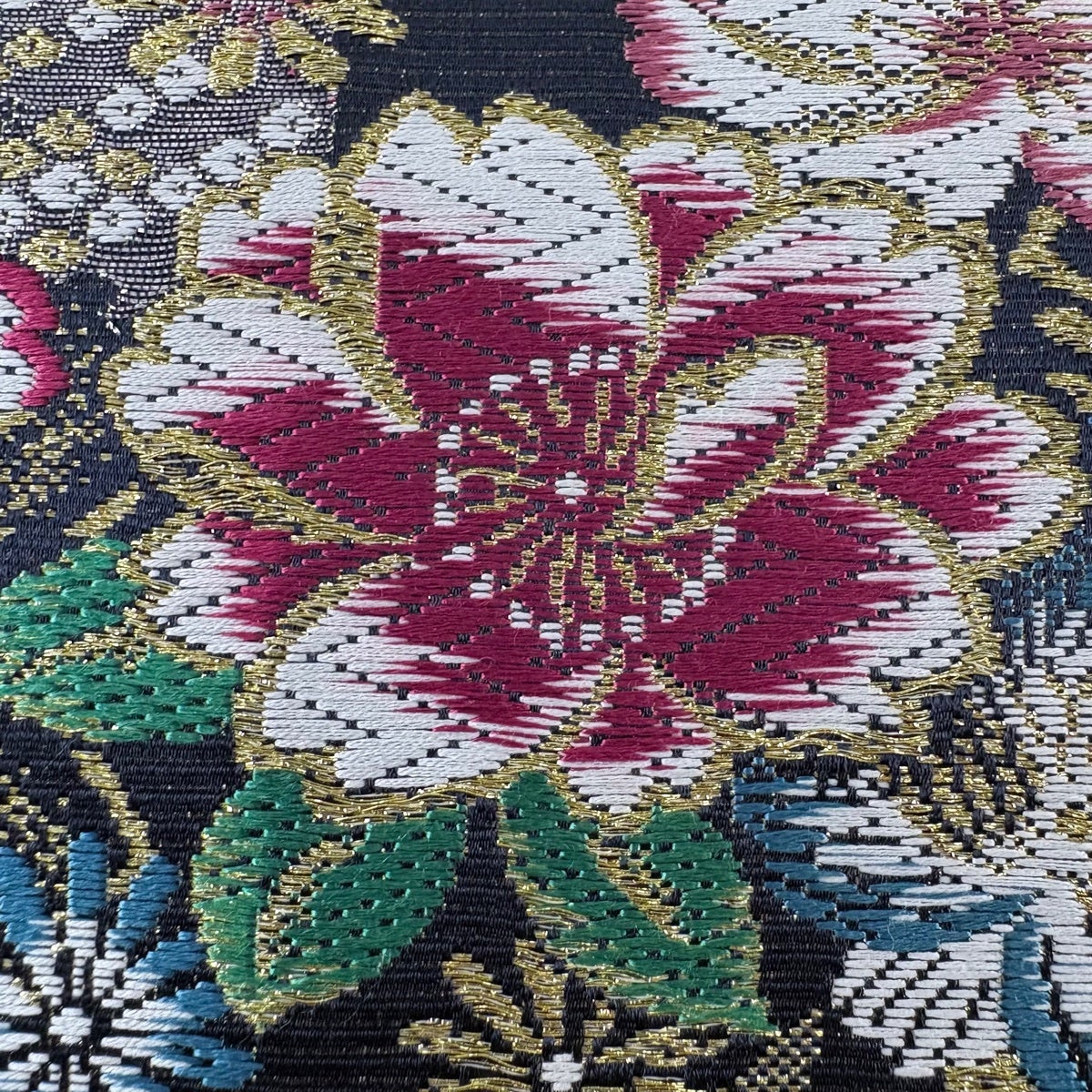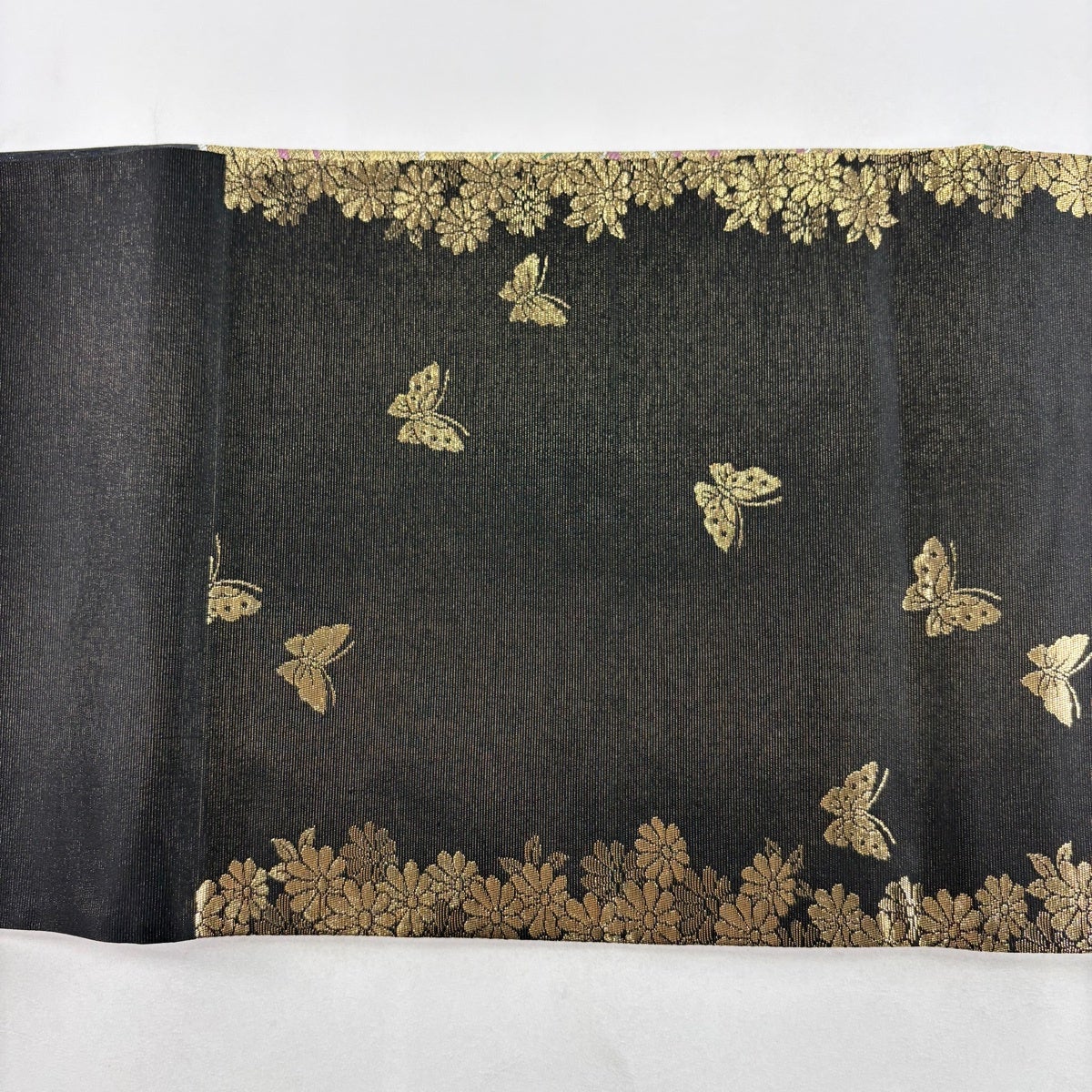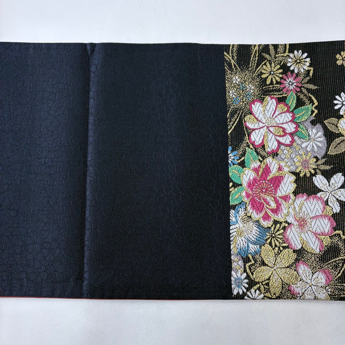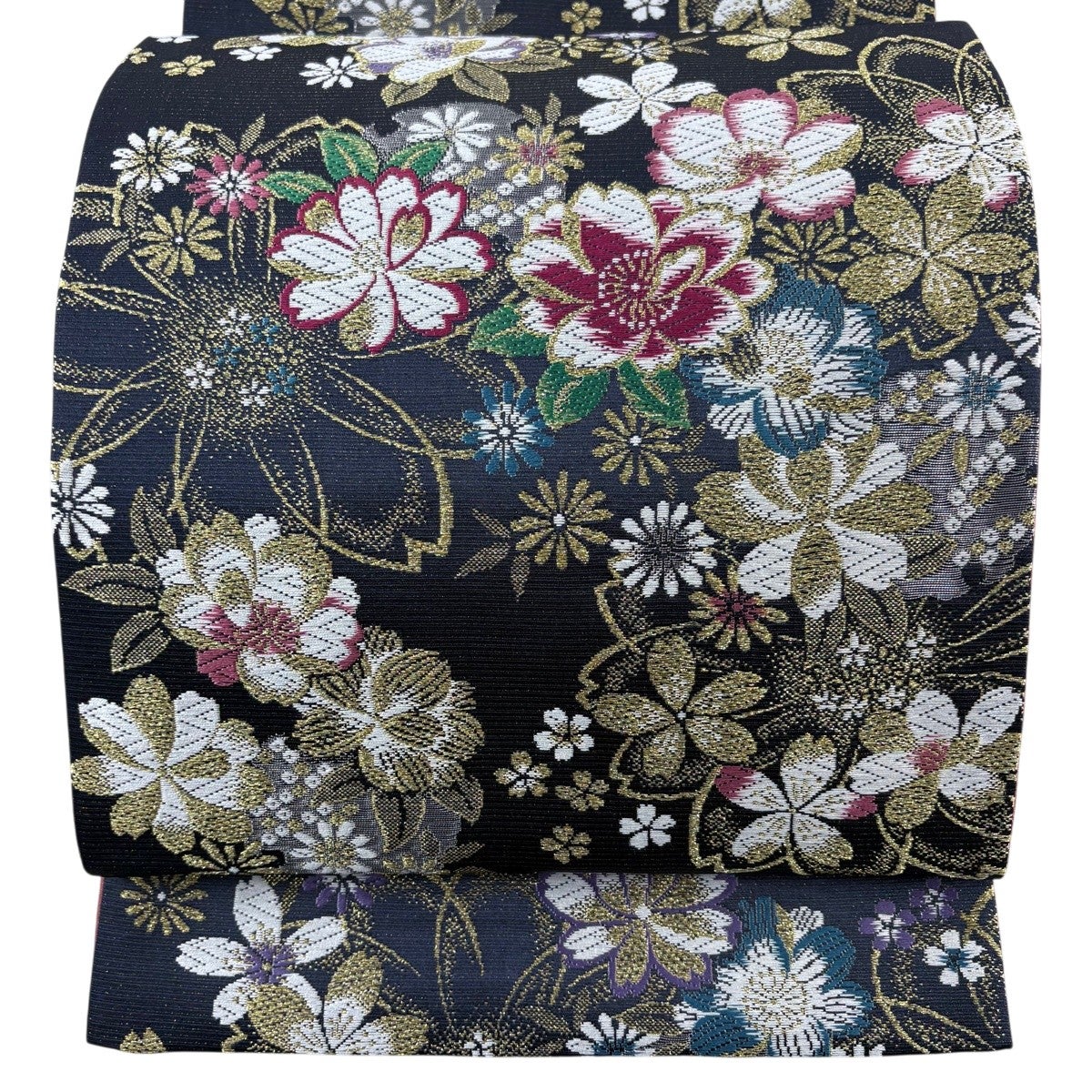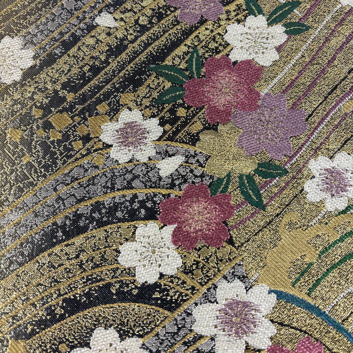袋帯 秀品 関西仕立て 桜 桧扇 唐織 箔 黒 六通 正絹