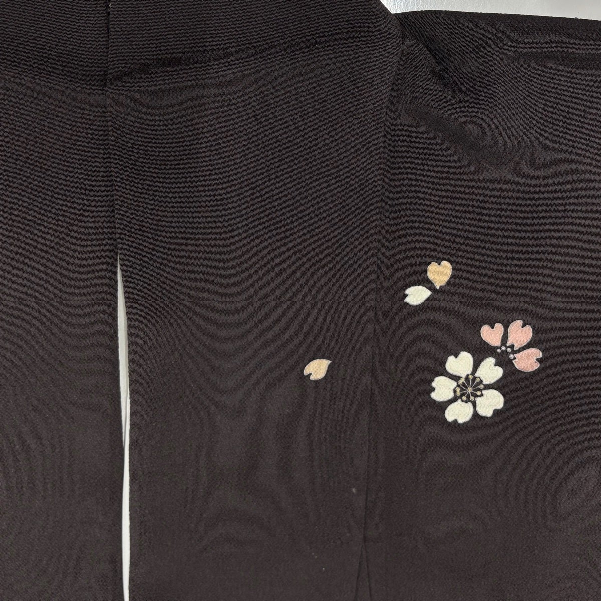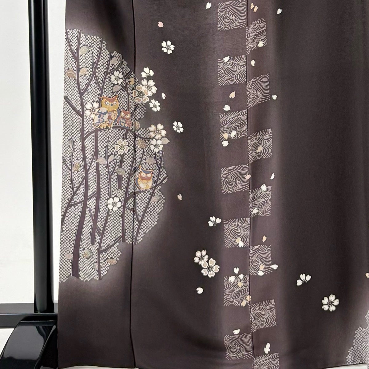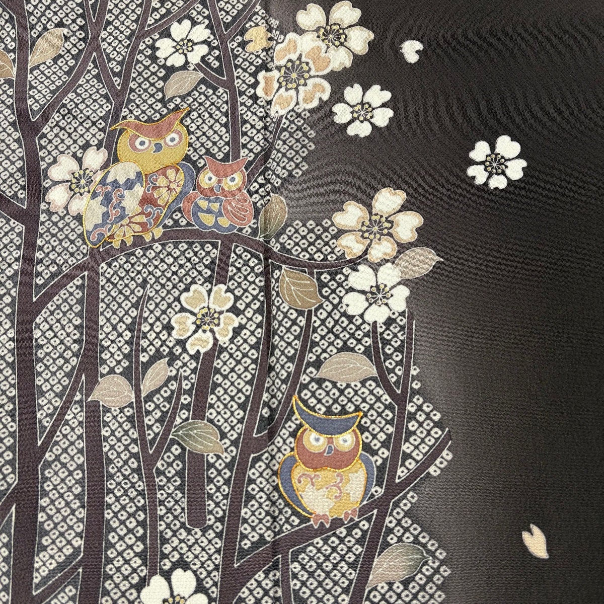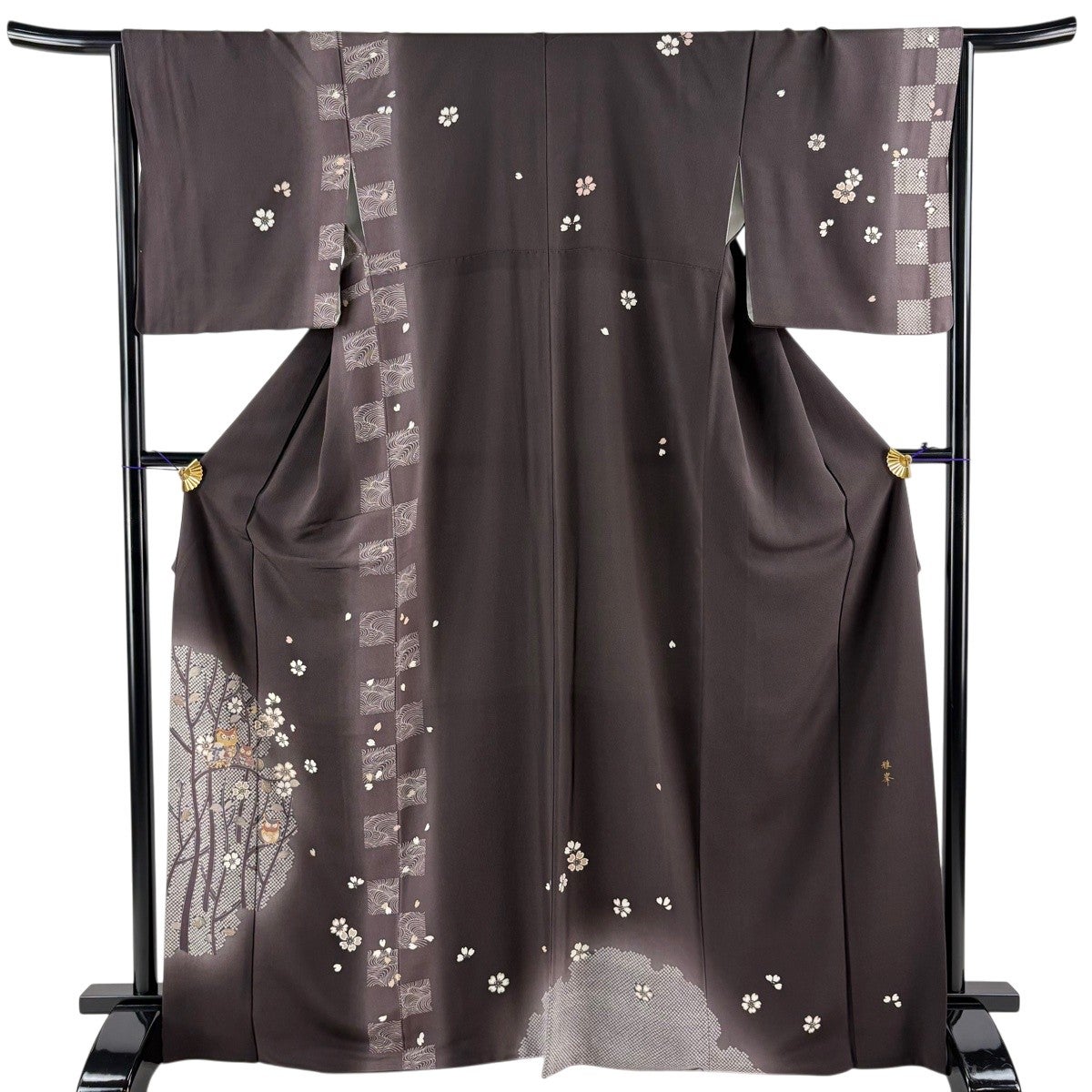 付下げ 身丈168.5cm 裄丈65cm M 袷 落款あり フクロウ 桜 金糸 縮緬 茶紫 正絹 名品