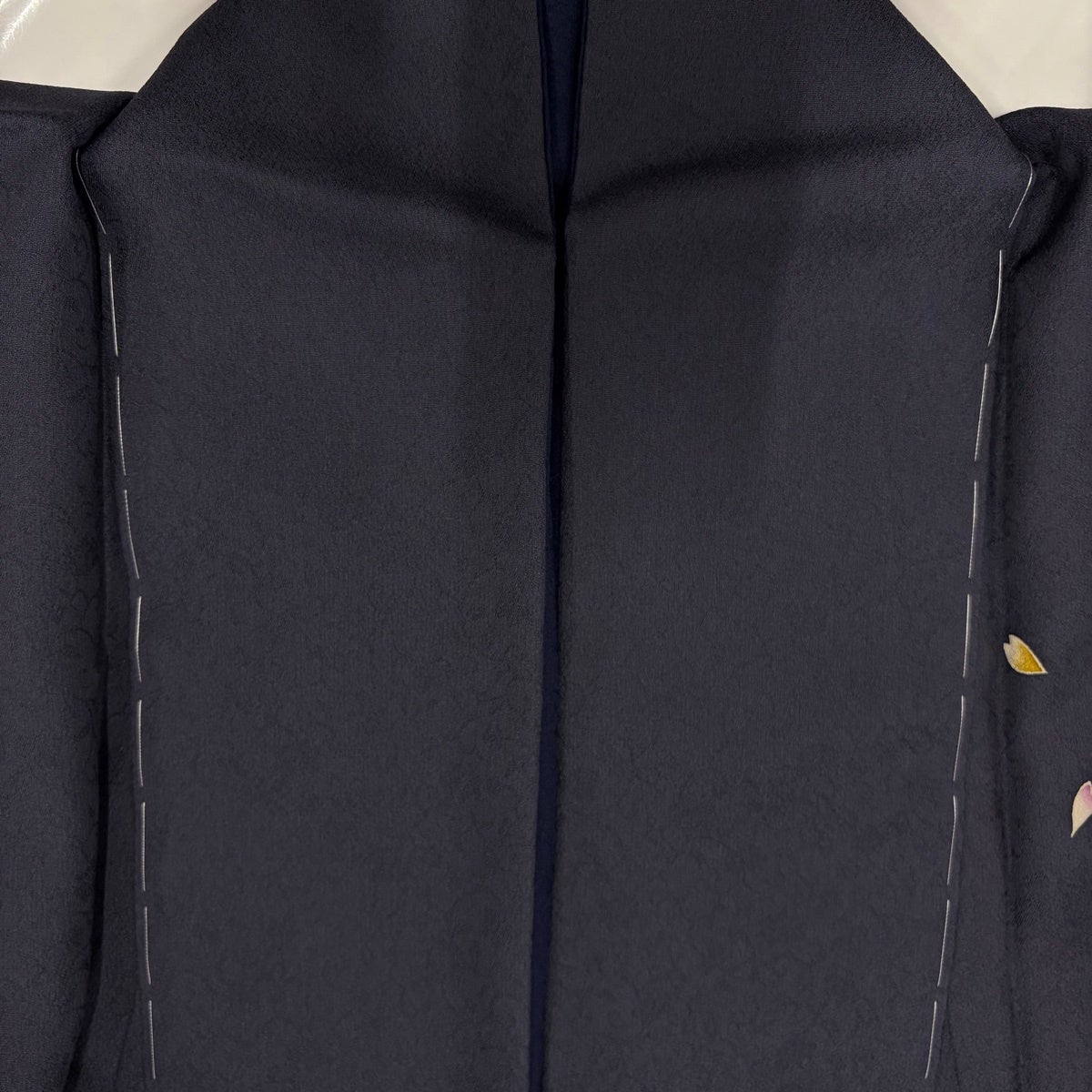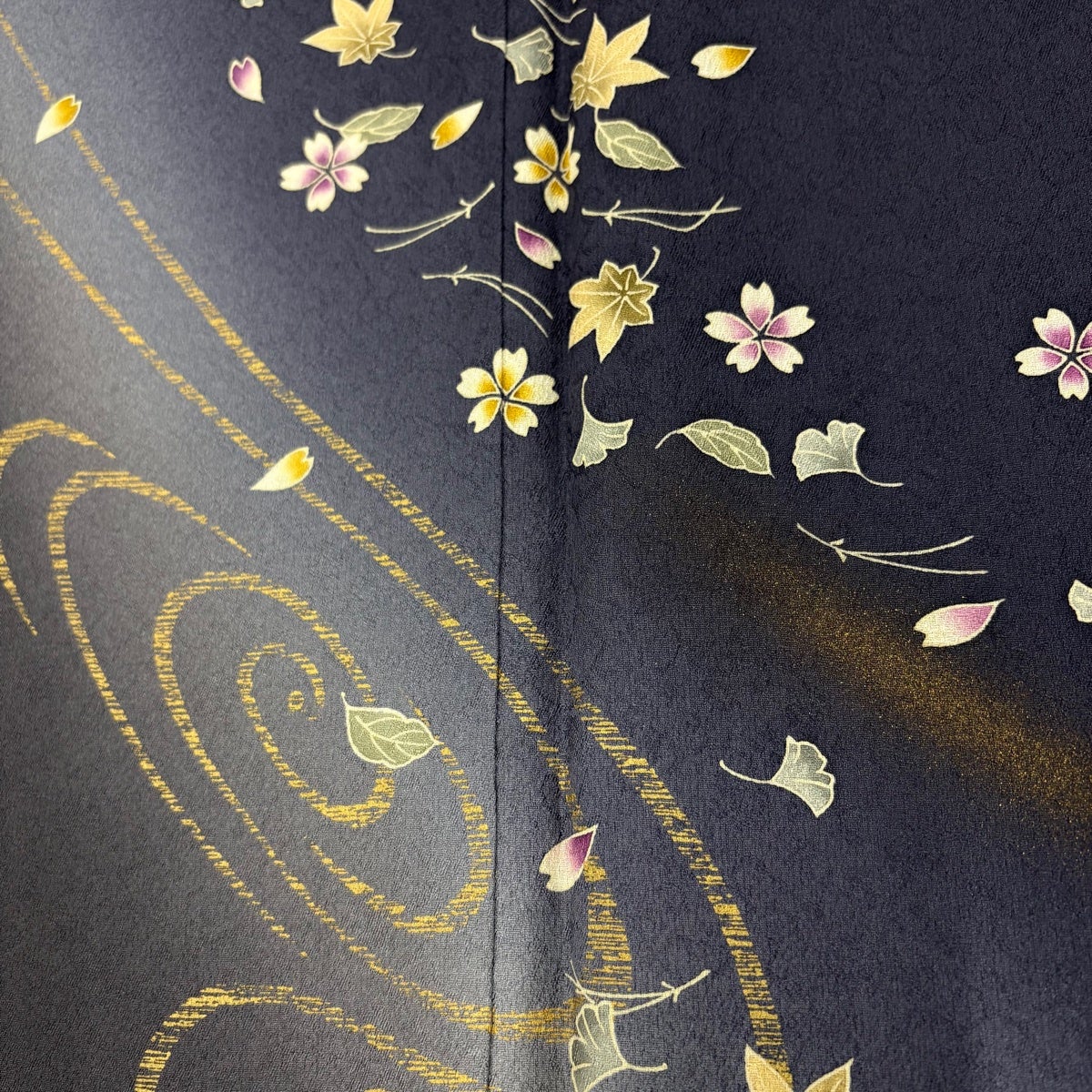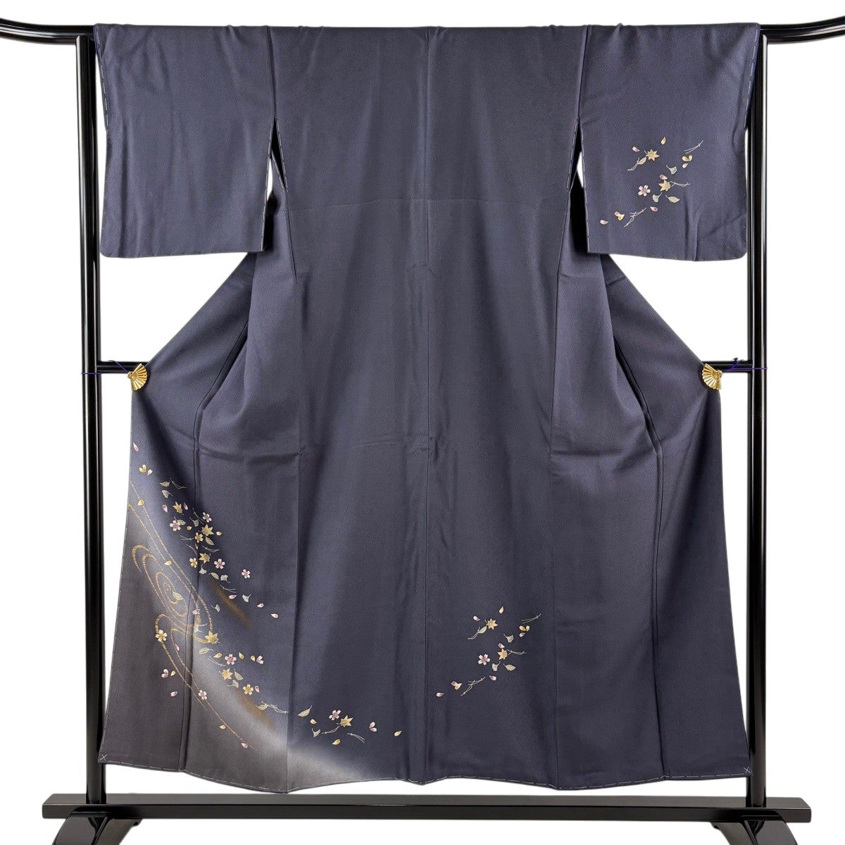【美品】 付下げ 身丈152cm 裄丈64.5cm M 袷 やまと 桜 流水 金彩 ぼかし 濃紺 正絹 秀品