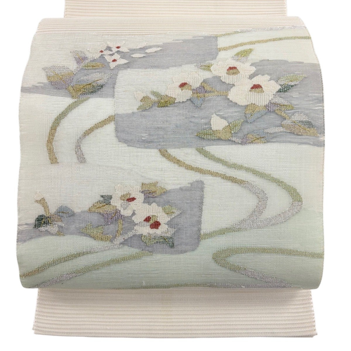 【美品】 袋帯 秀品 夏帯 絽 椿 流水 金銀糸 クリーム お太鼓柄 正絹