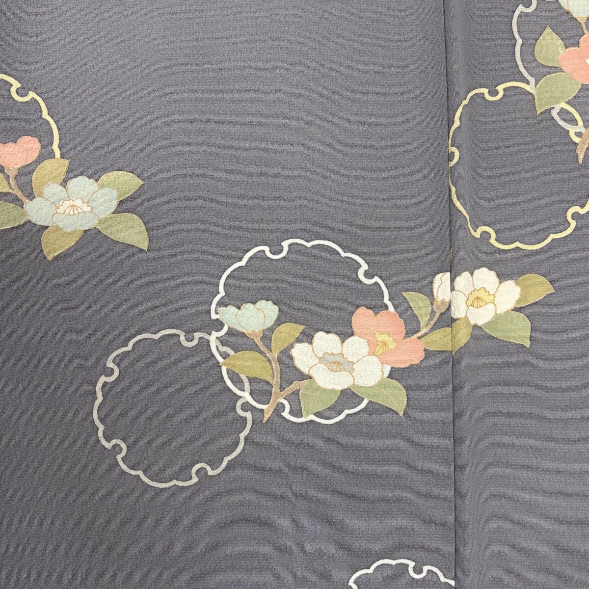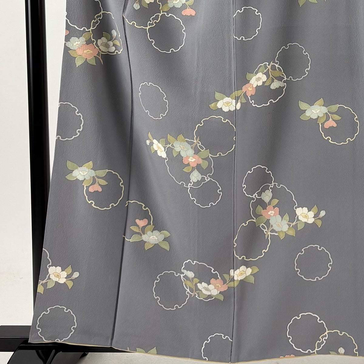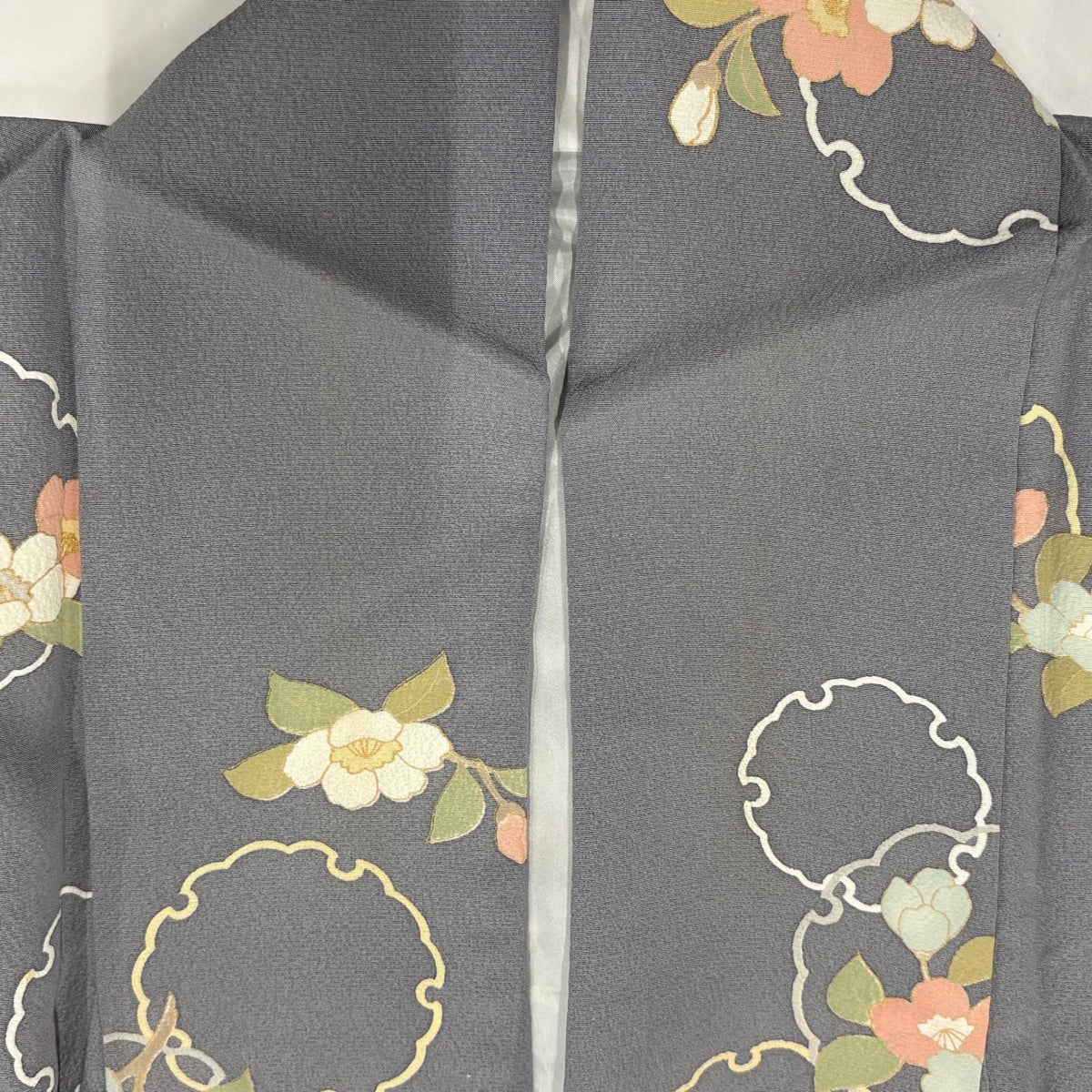 付下げ 身丈162.5cm 裄丈64cm M 袷 椿 菊 灰色 正絹 秀品