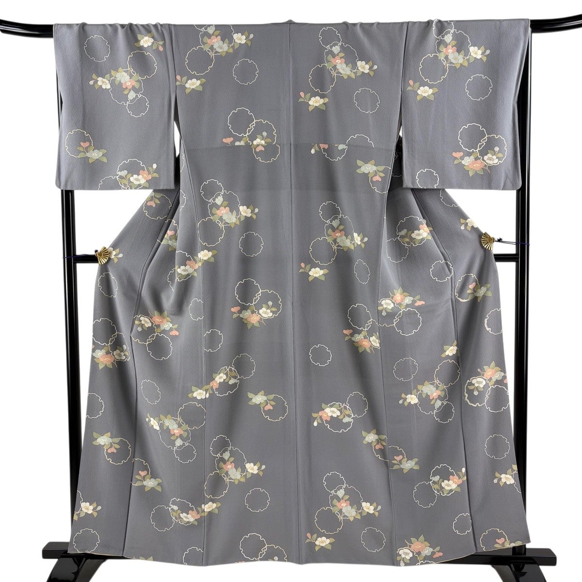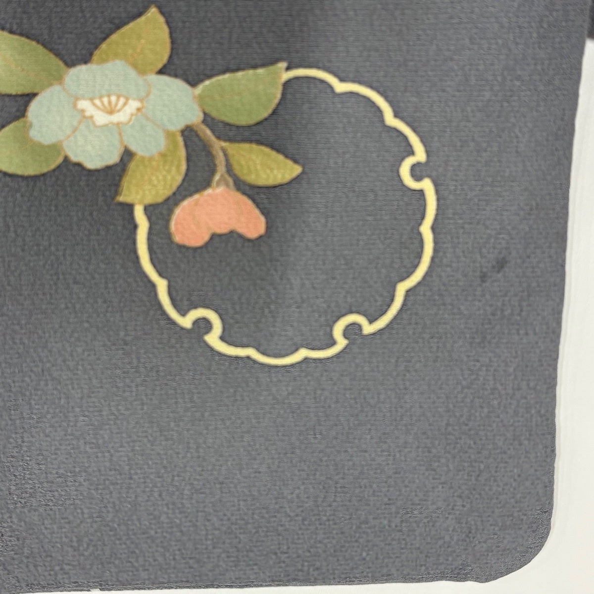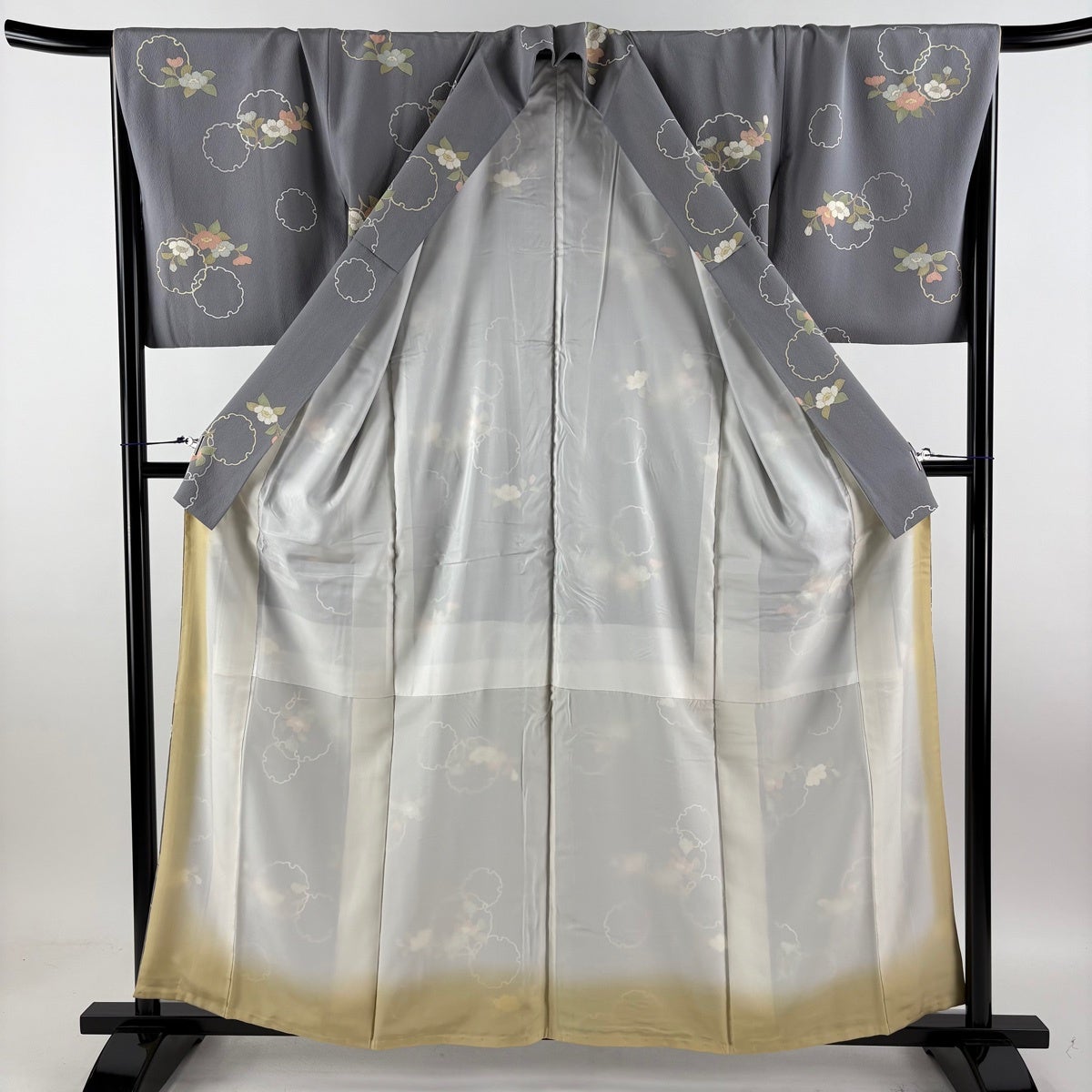 付下げ 身丈162.5cm 裄丈64cm M 袷 椿 菊 灰色 正絹 秀品