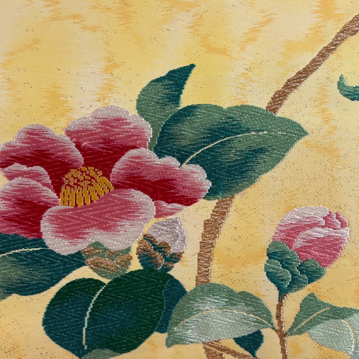 【美品】 袋帯 名品 じゅらく 落款あり 椿 金糸 金色 お太鼓柄 正絹