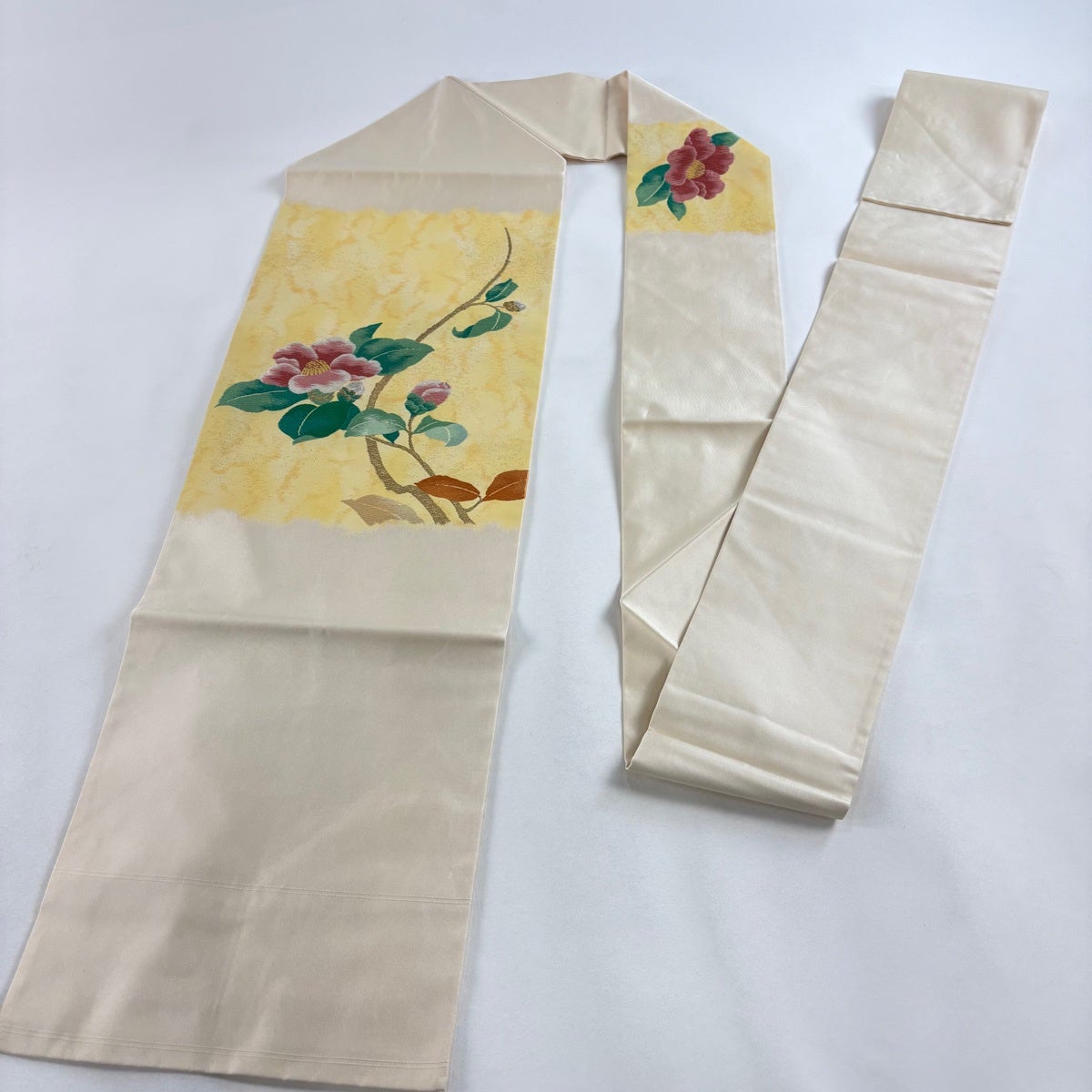 【美品】 袋帯 秀品 木屋太 落款あり 本袋 椿 山吹茶色 六通 正絹