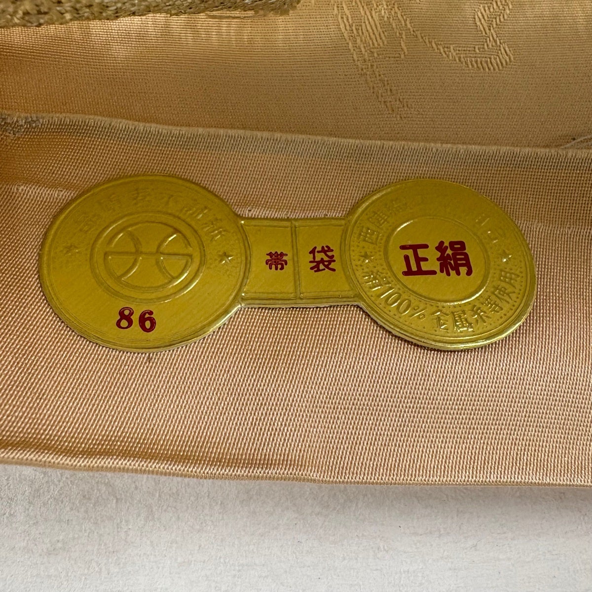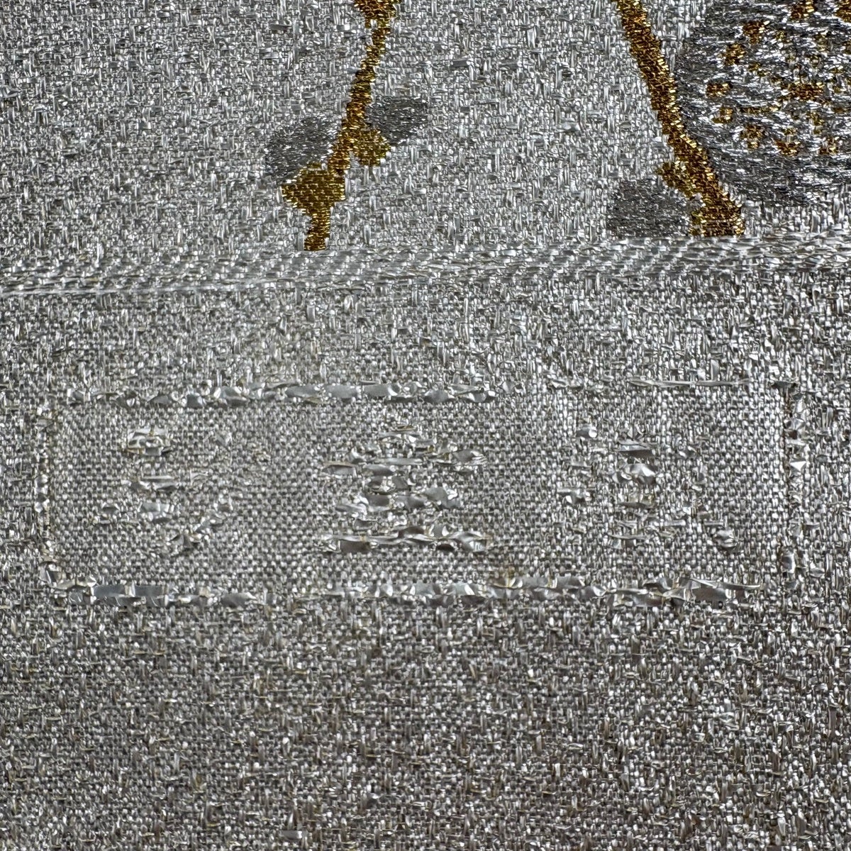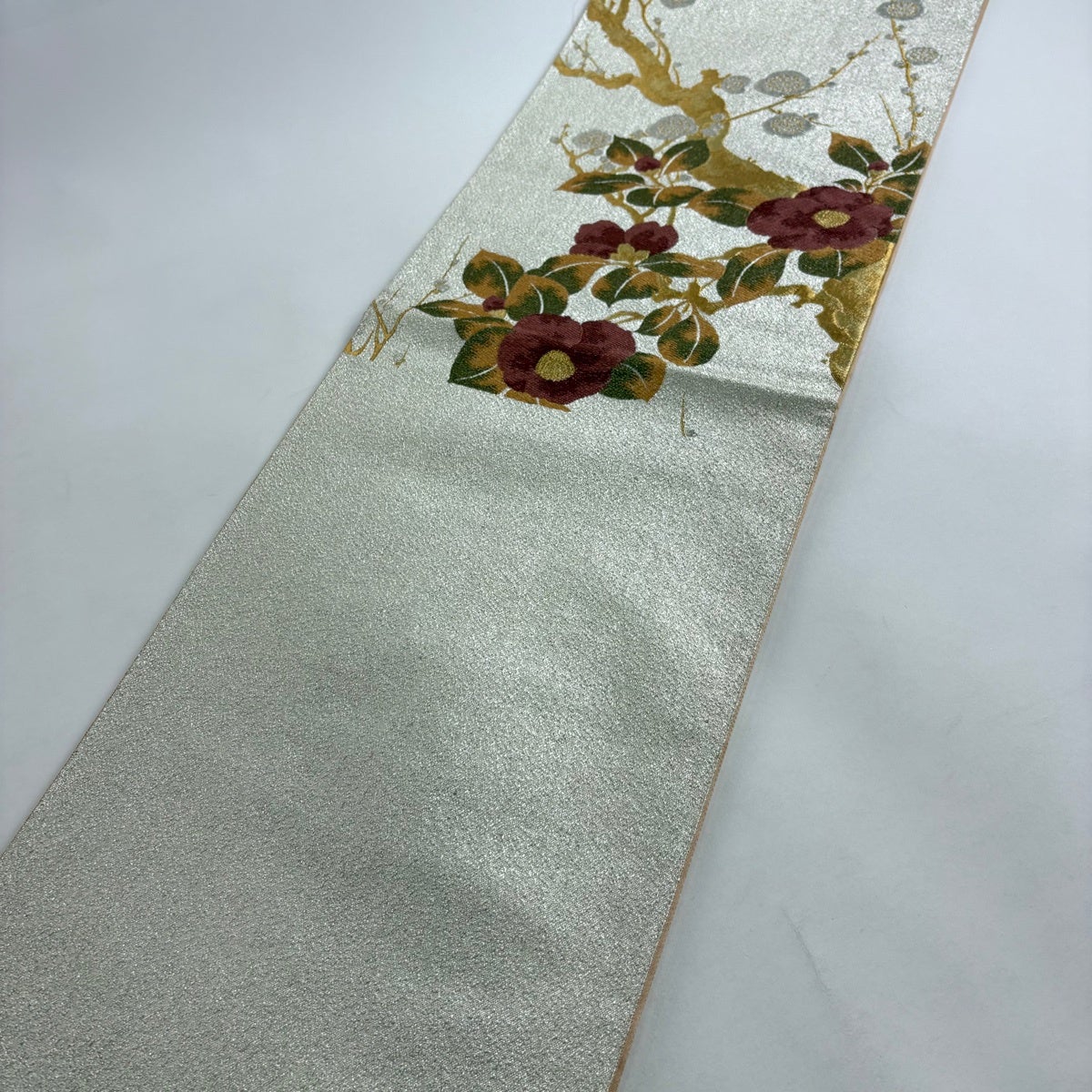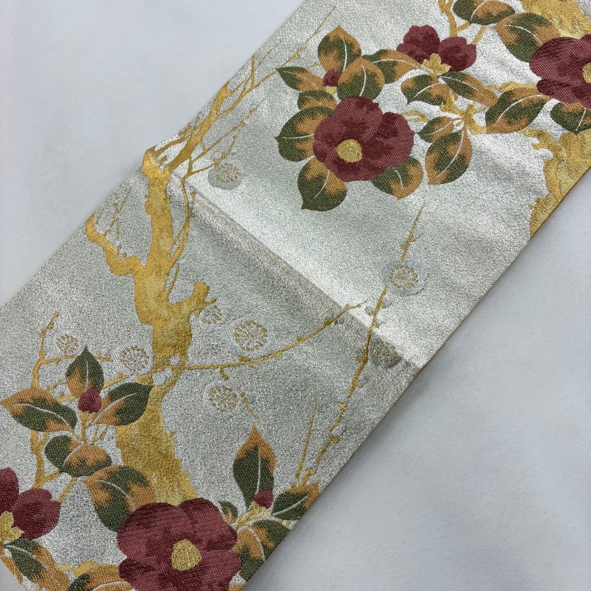 【美品】 袋帯 名品 証紙あり 砂金織 椿 梅 金銀糸 箔 銀色 六通 正絹