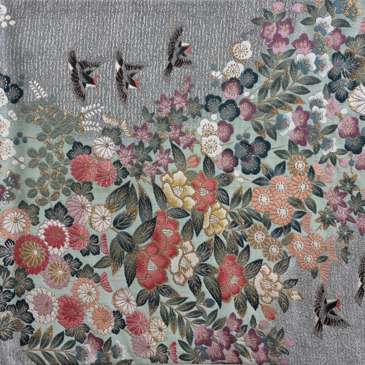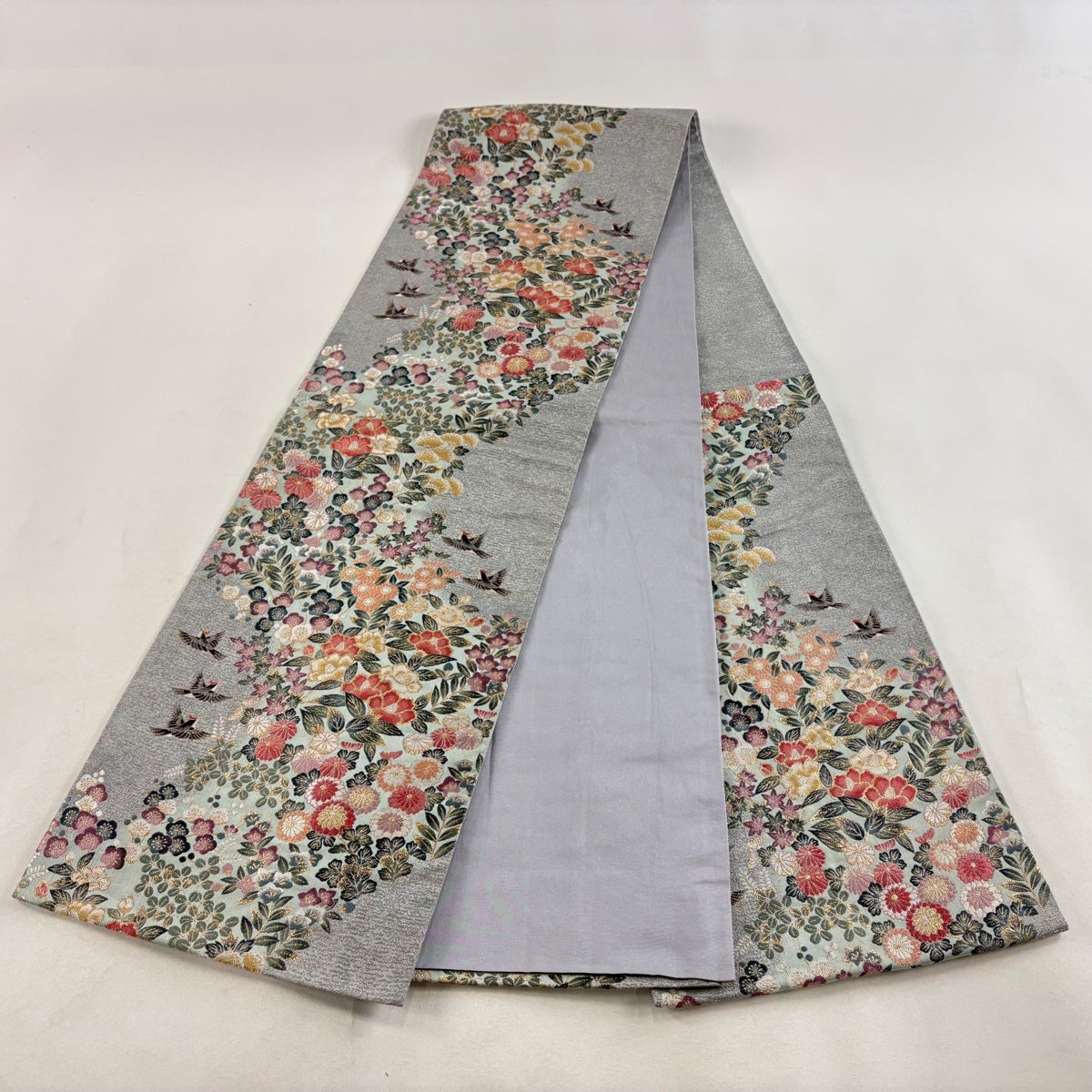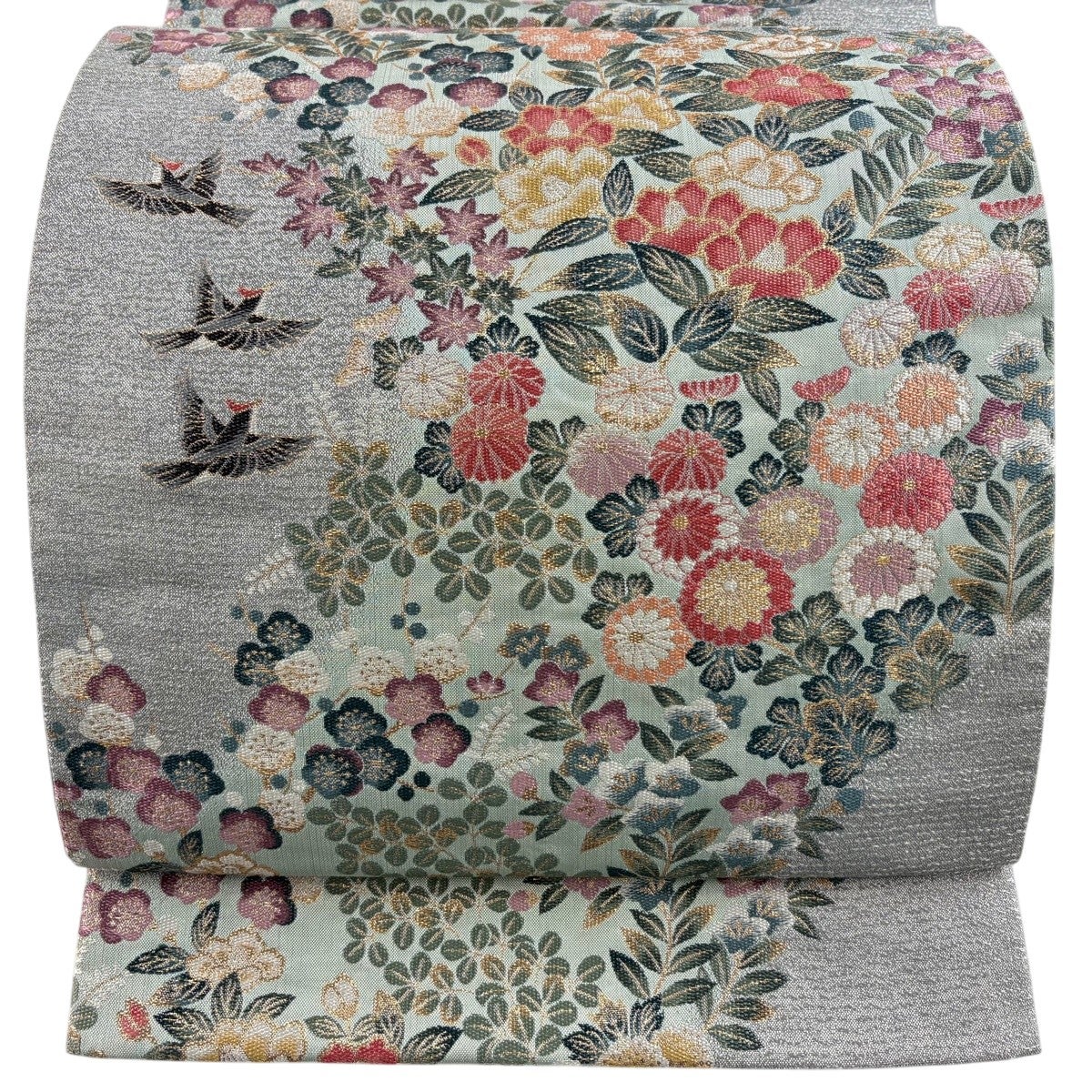 袋帯 逸品 じゅらく 落款あり 椿 桜 金糸 箔 青灰色 六通 正絹