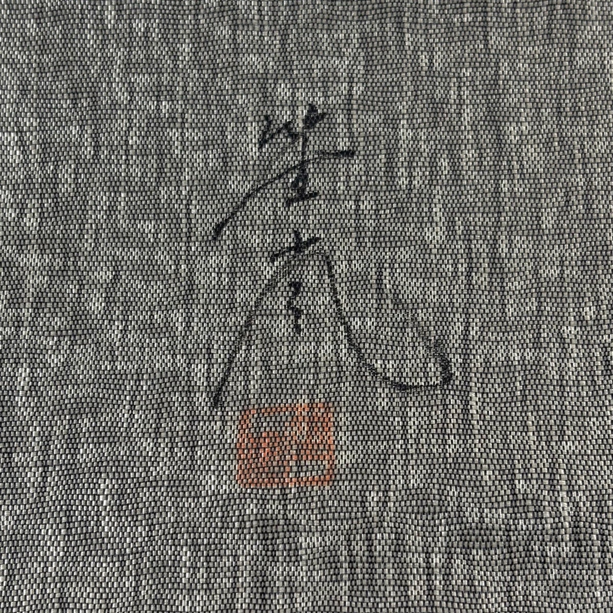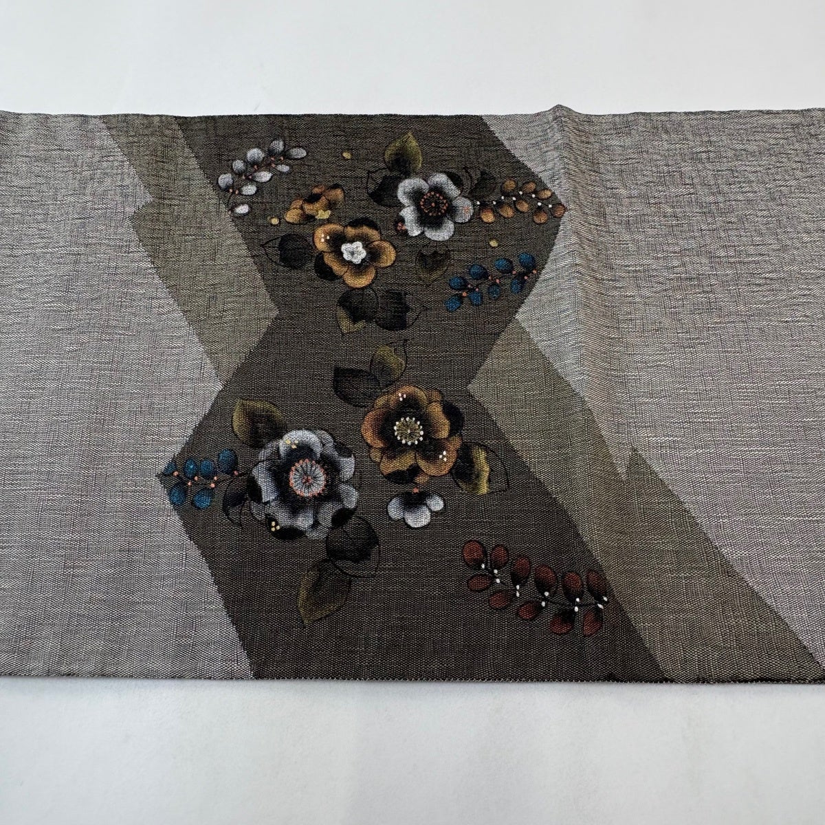 【美品】 袋帯 秀品 落款あり 紬地 椿 草花 金銀彩 灰色 お太鼓柄 正絹