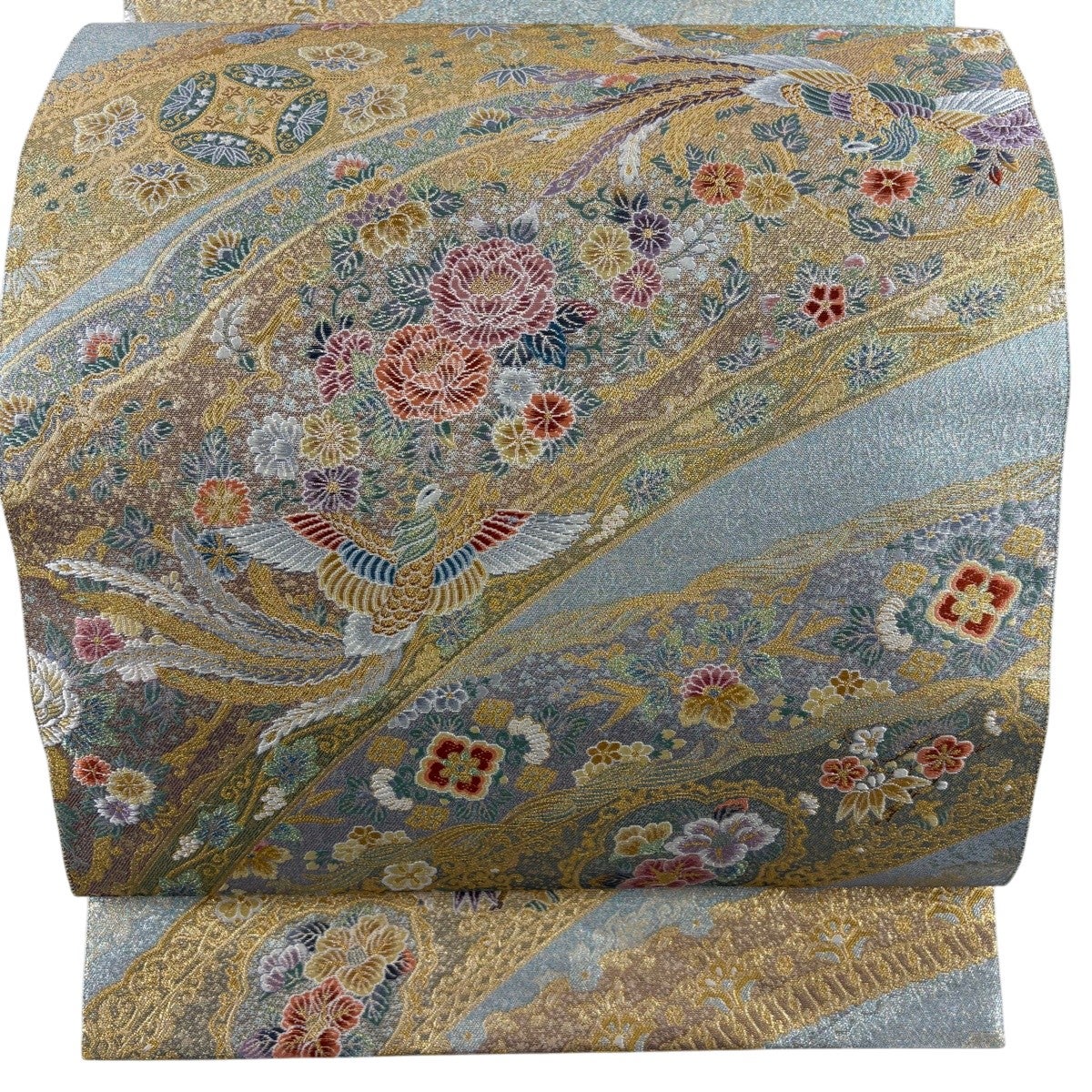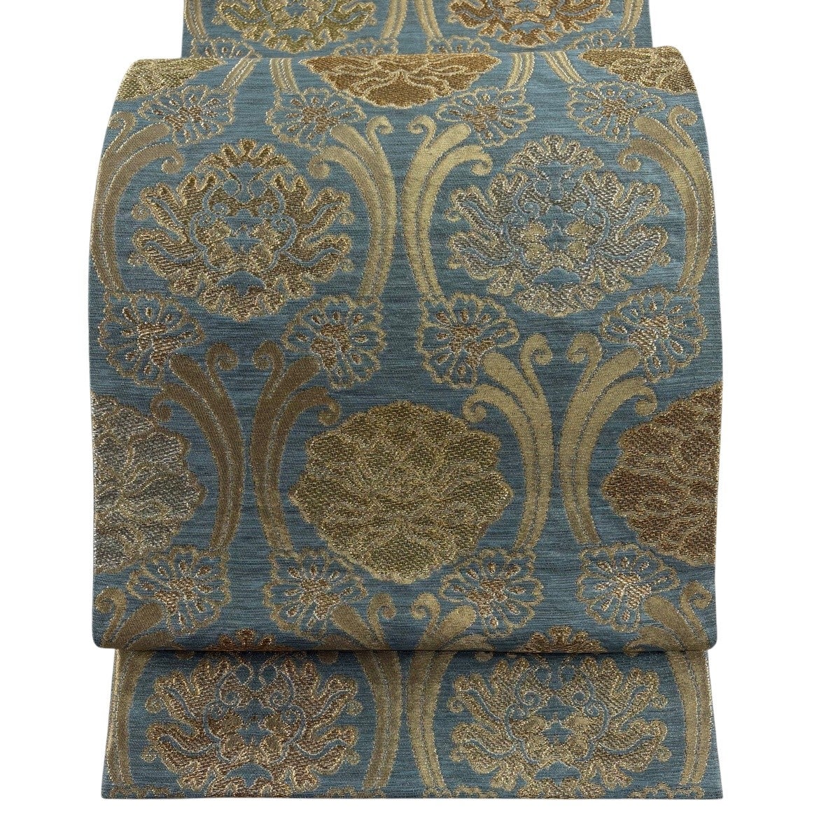 50%OFF 【美品】 袋帯 秀品 華文 草花 金銀糸 水色 六通 正絹 K50
