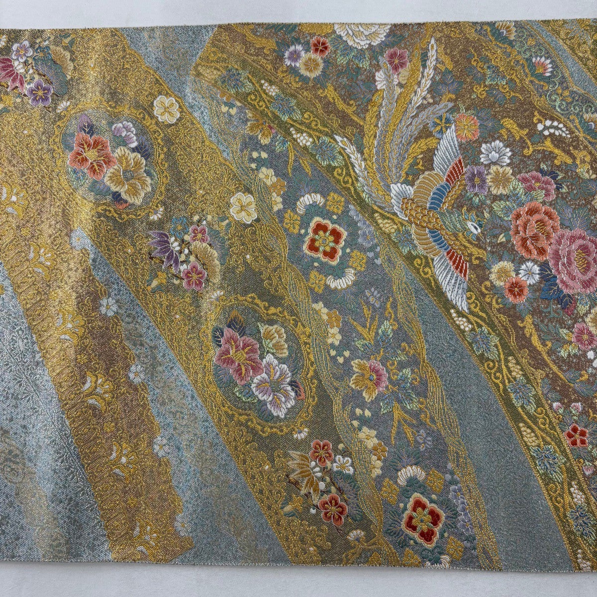 70%OFF 袋帯 秀品 落款あり 花びら 斜縞 水色 お太鼓柄 正絹 K70