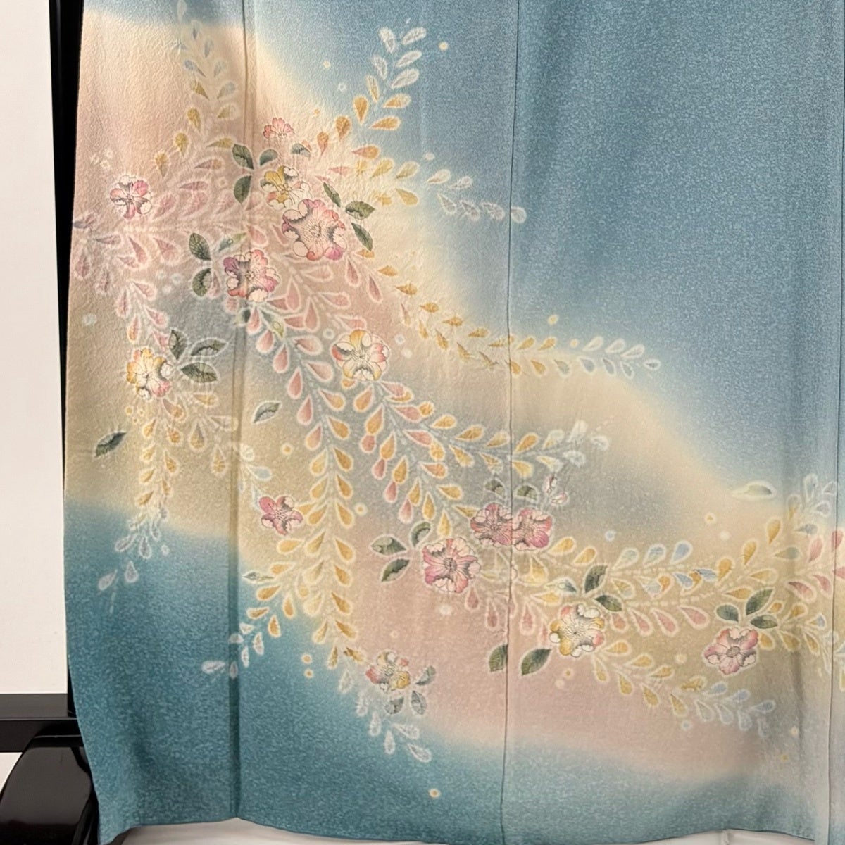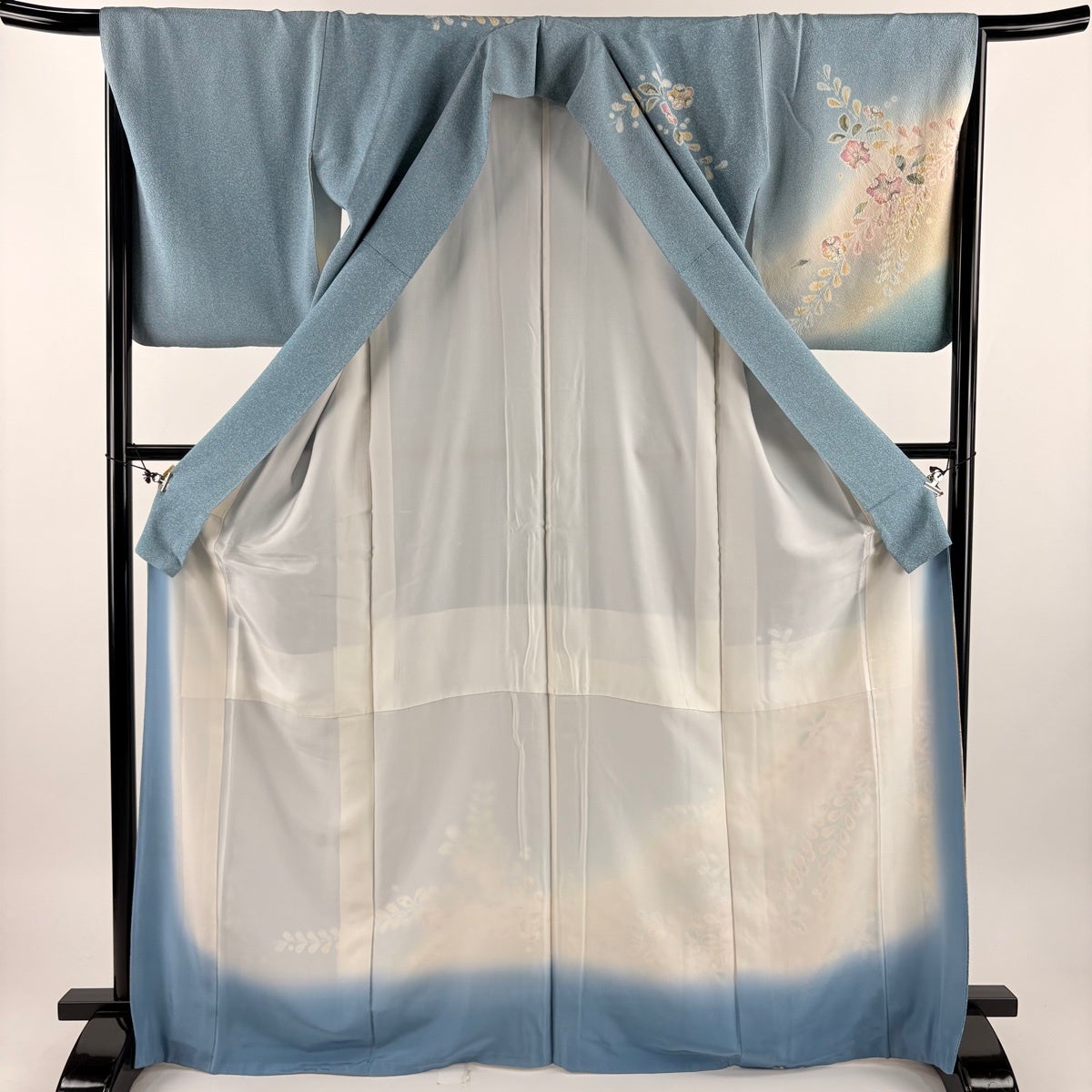 訪問着 身丈154cm 裄丈63cm S 単衣 草花 金彩 水色 正絹 秀品
