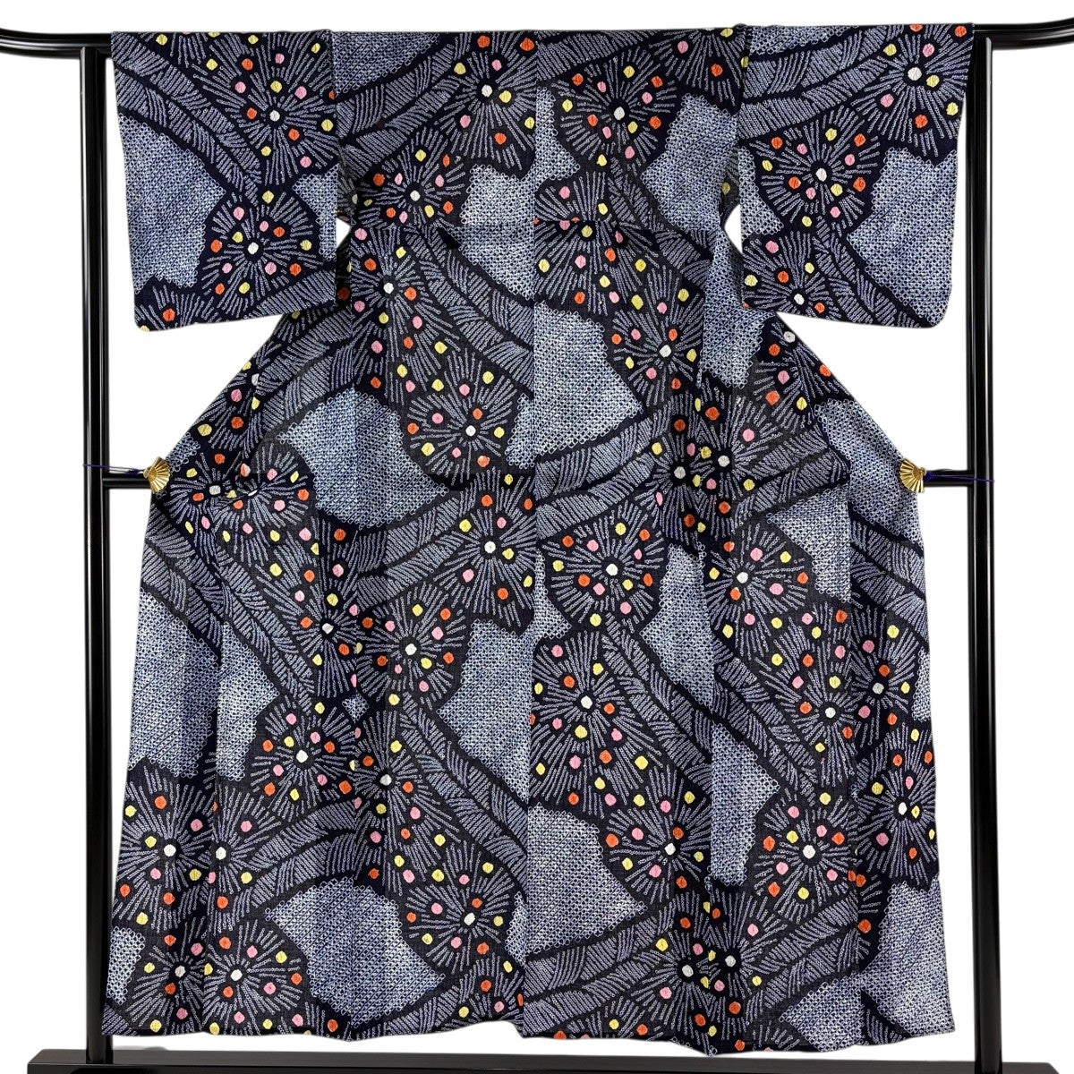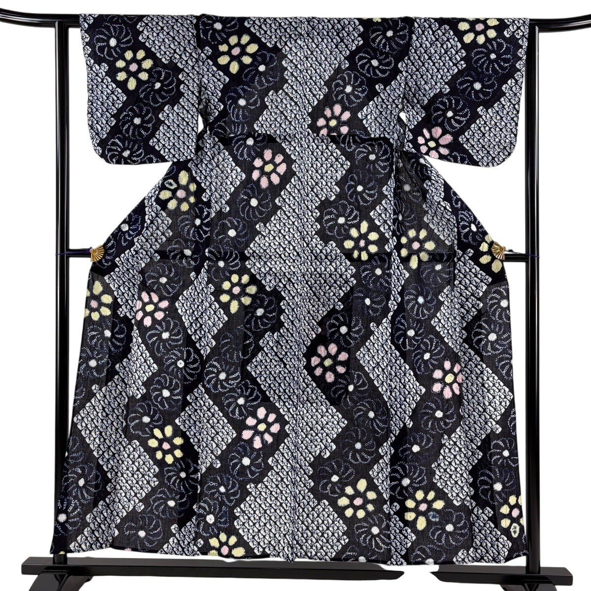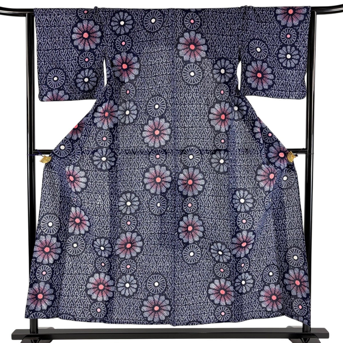 【美品】 浴衣 身丈153cm 裄丈64cm M 絞り浴衣 菊 幾何学模様 紺色 綿 名品