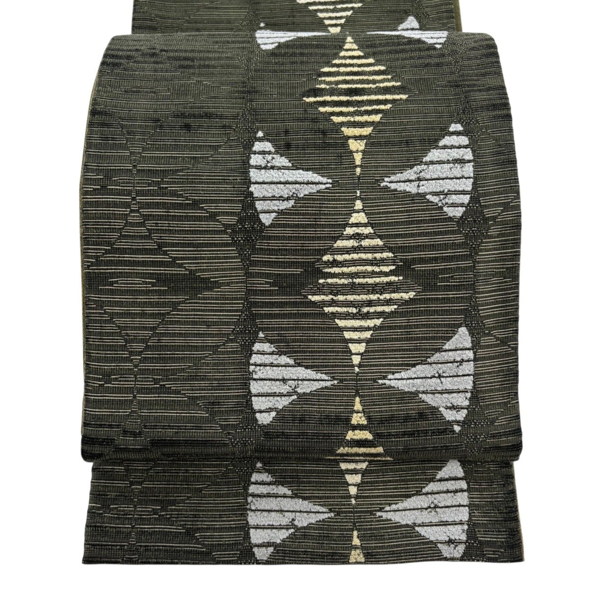 袋帯 秀品 斜縞 幾何学模様 箔 金糸 深緑 六通 正絹
