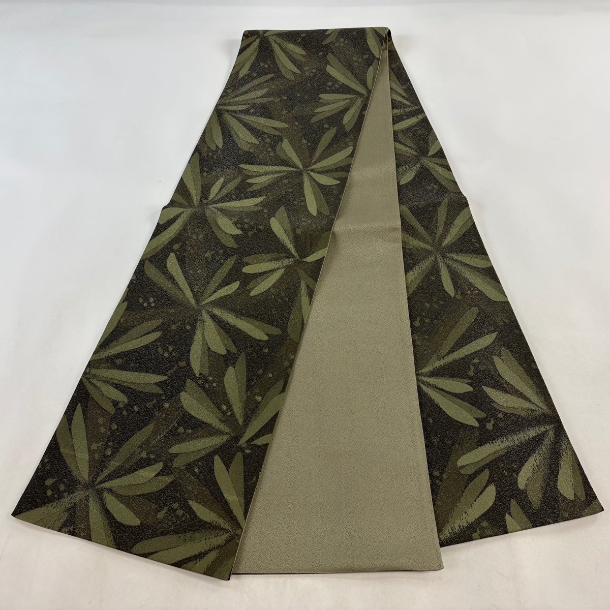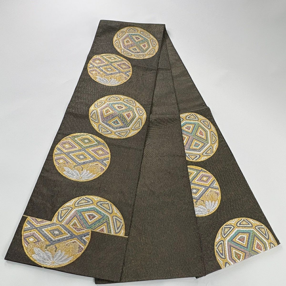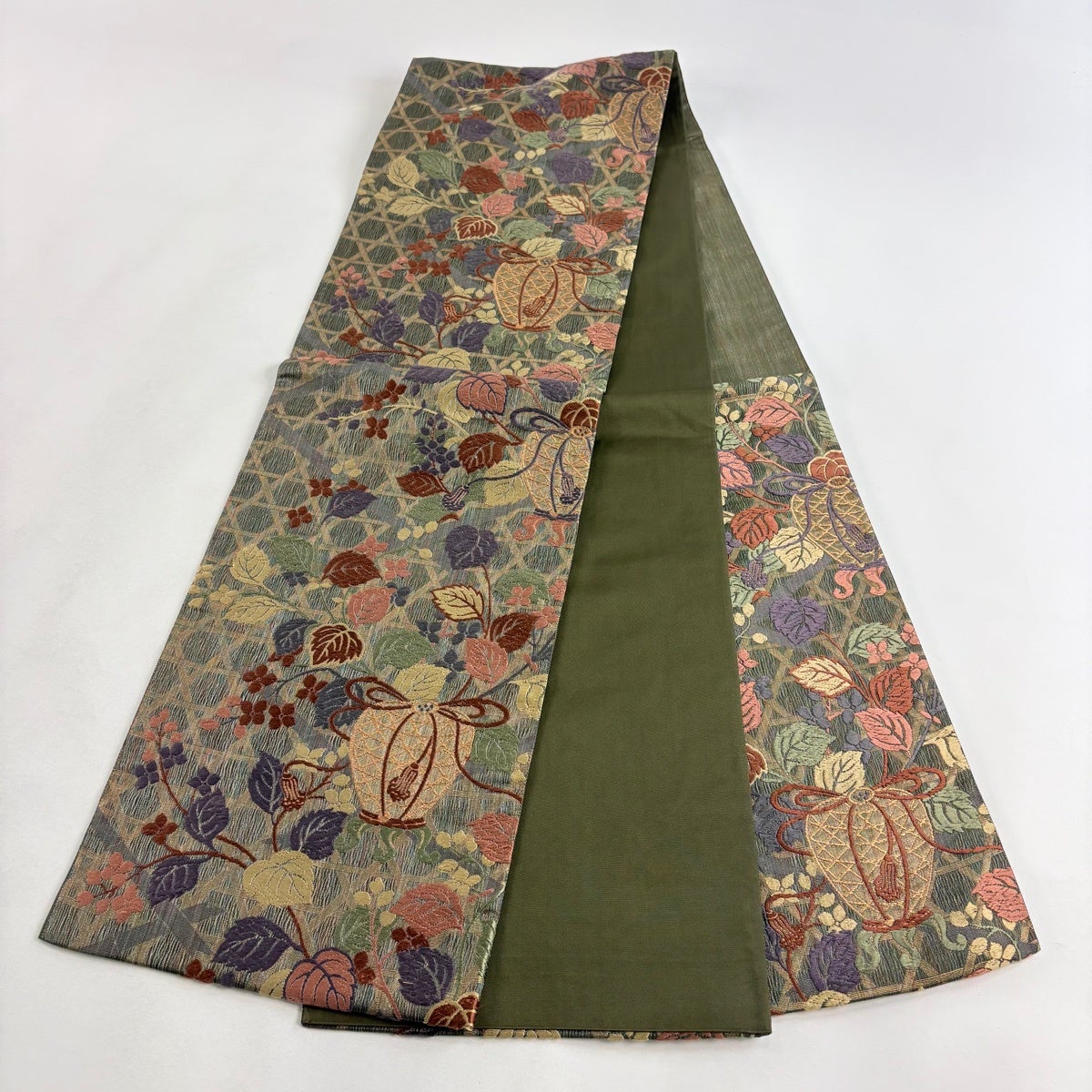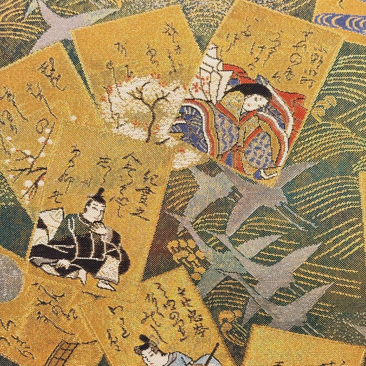 50%OFF 袋帯 逸品 扇面 草花 刺繍 金糸 深緑 六通 正絹 K50