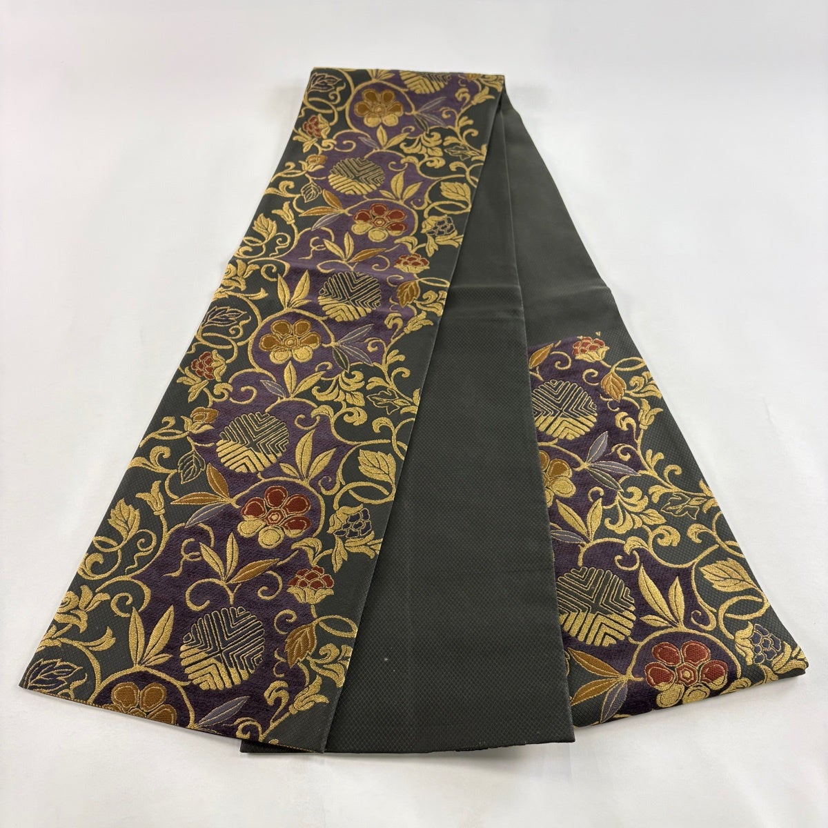 50%OFF 袋帯 秀品 華文 花唐草 金糸 箔 深緑 六通 正絹 K50