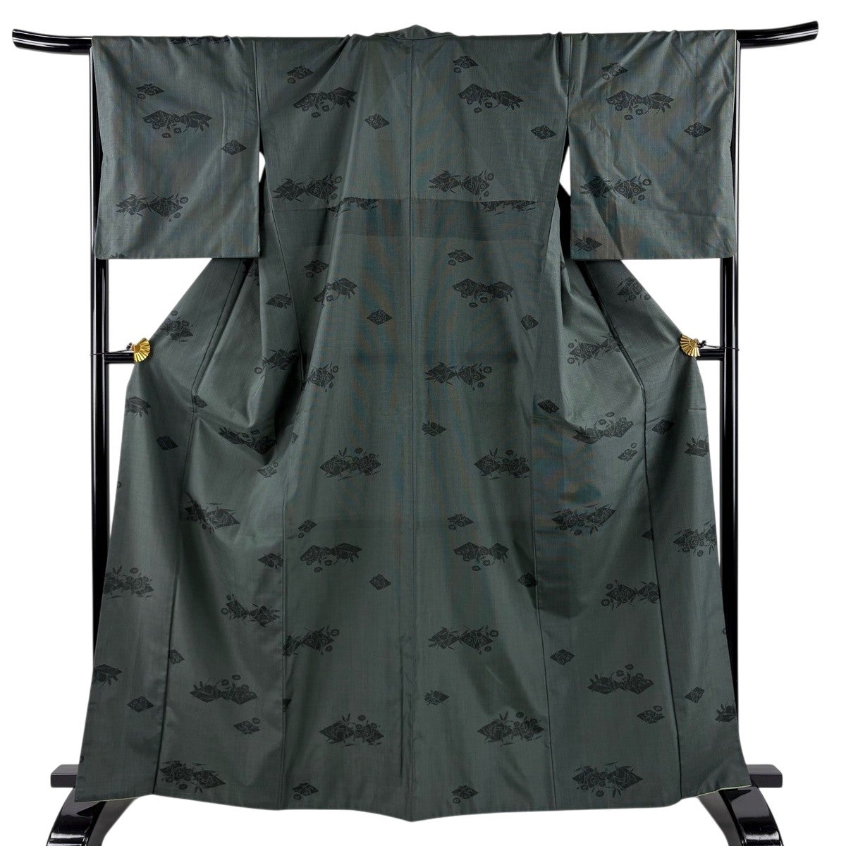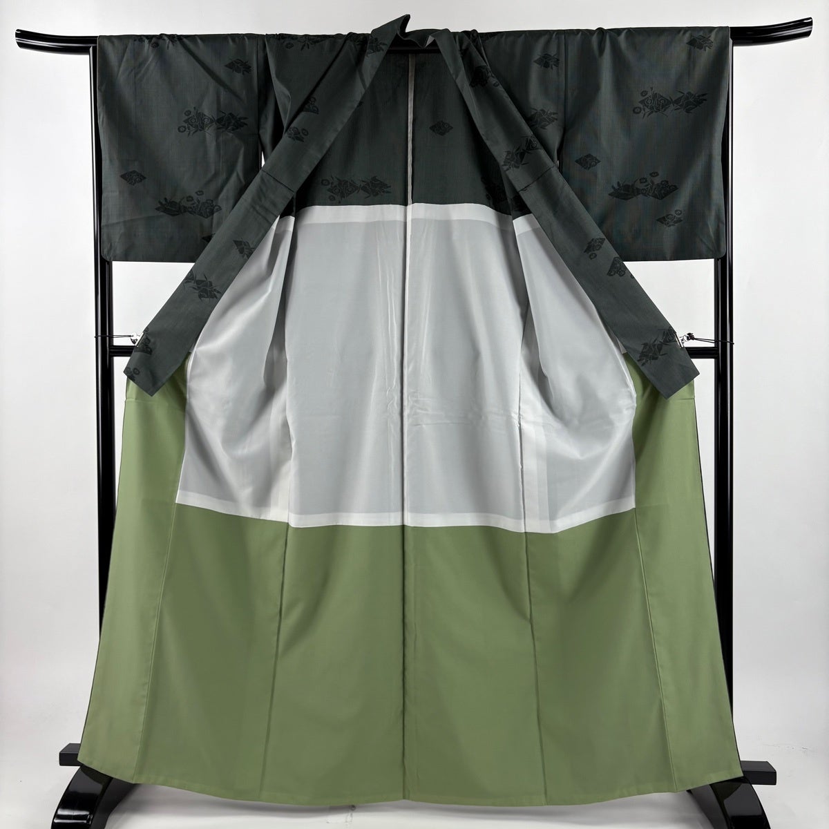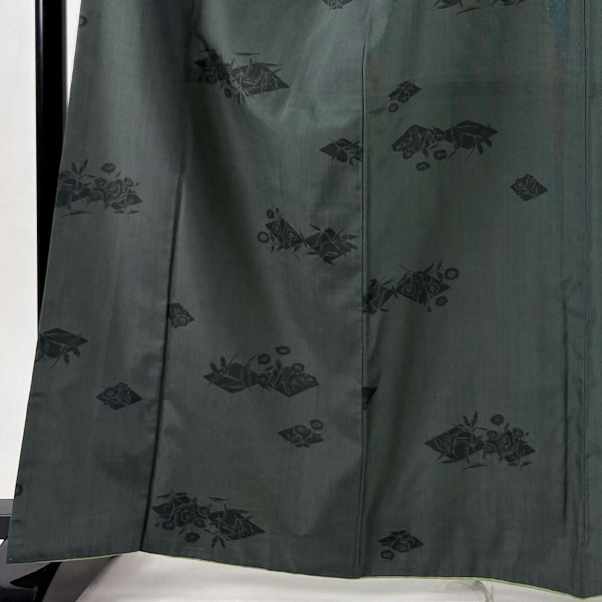 紬 身丈165cm 裄丈67cm M 袷 背抜き 草花 菱 深緑 正絹 秀品