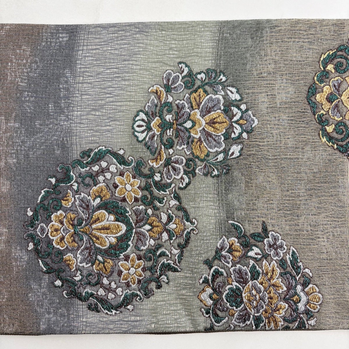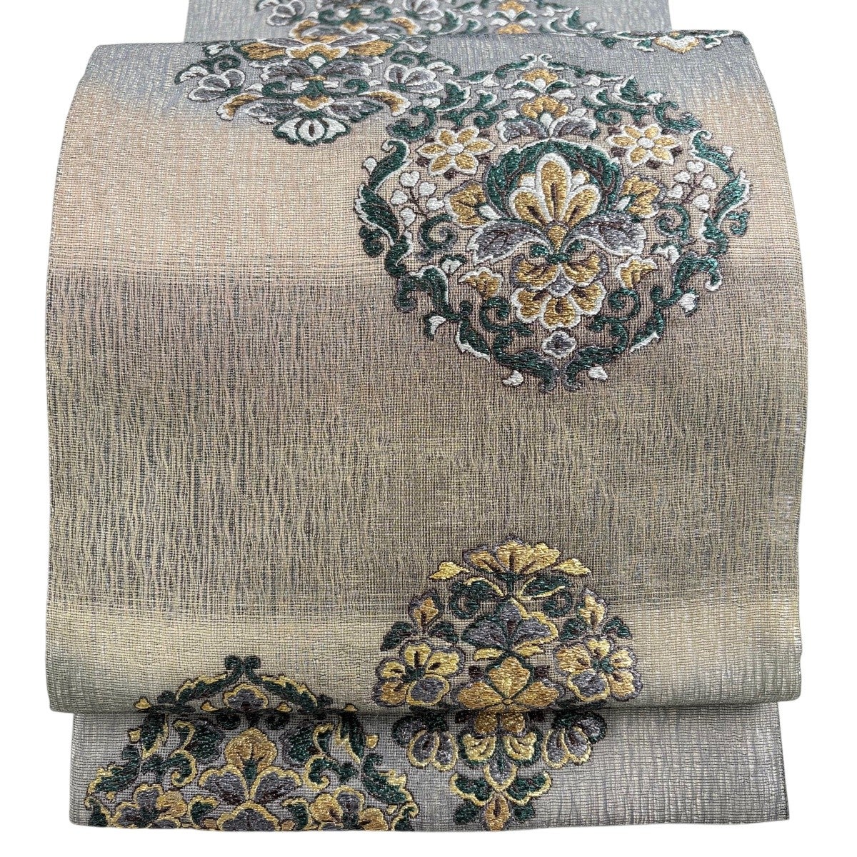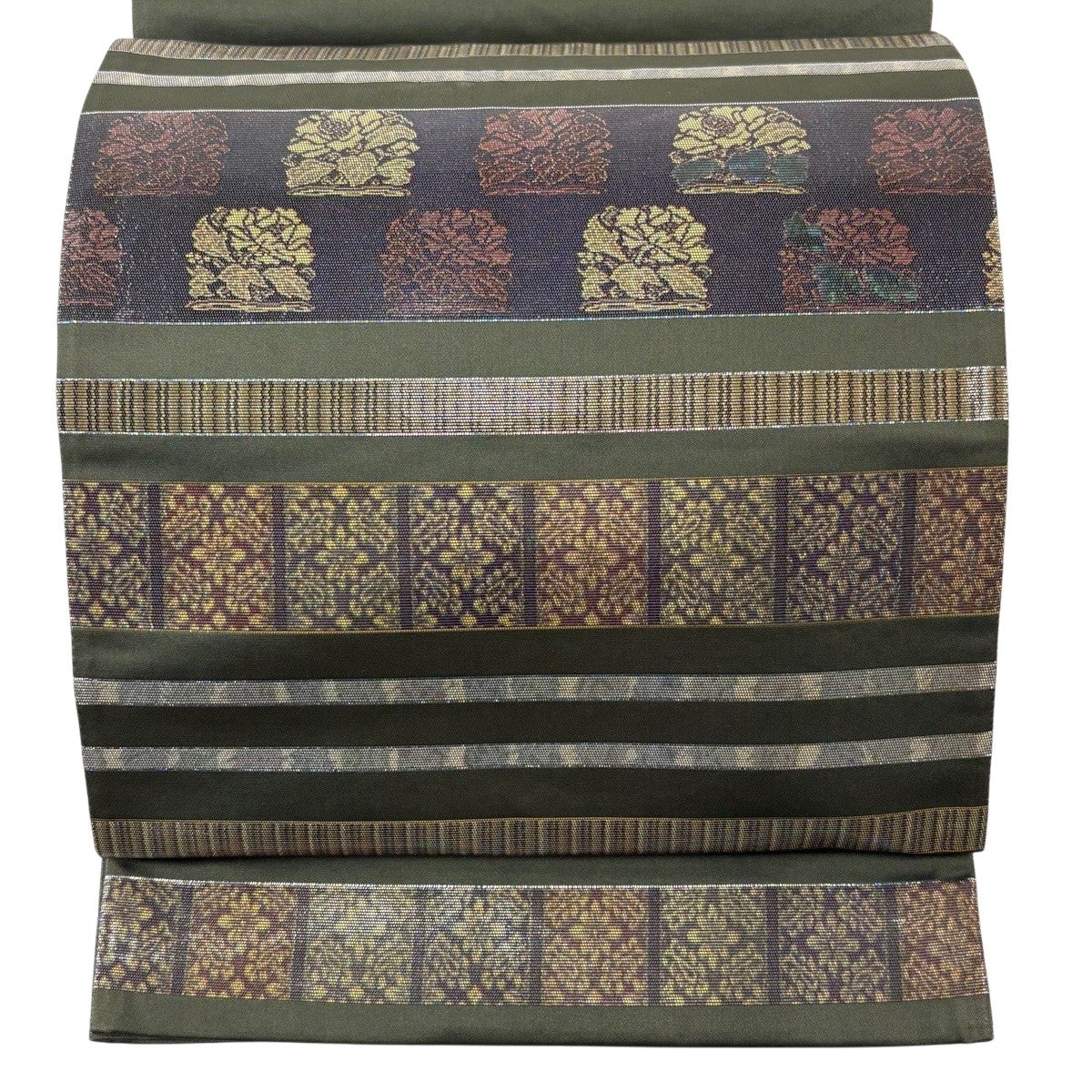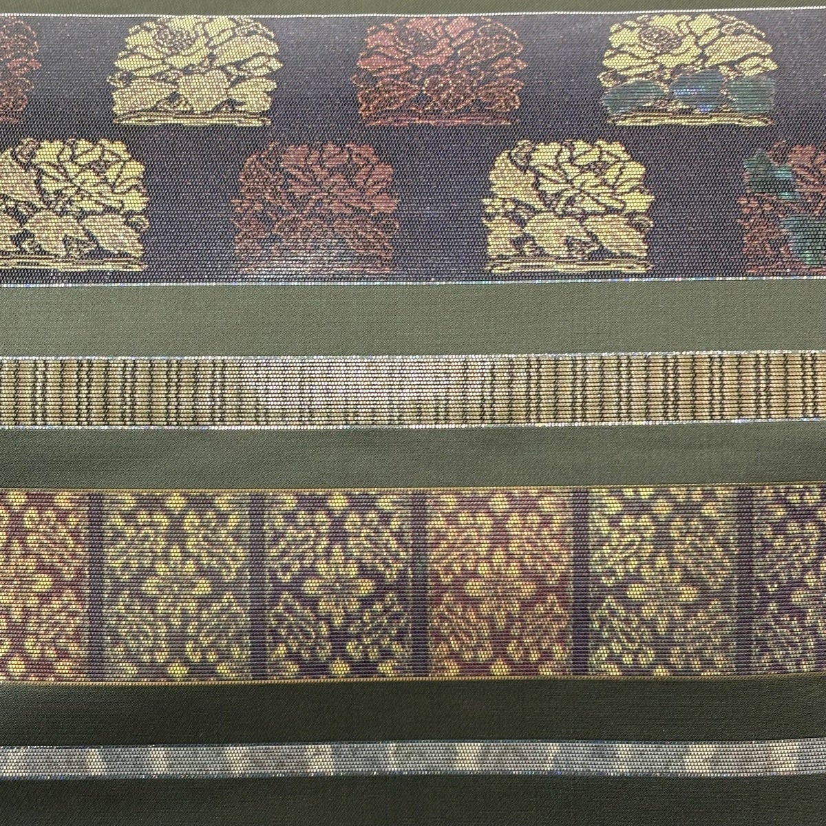 30%OFF 袋帯 秀品 青銅箔華紋 金銀糸 箔 深緑 六通 正絹 K30