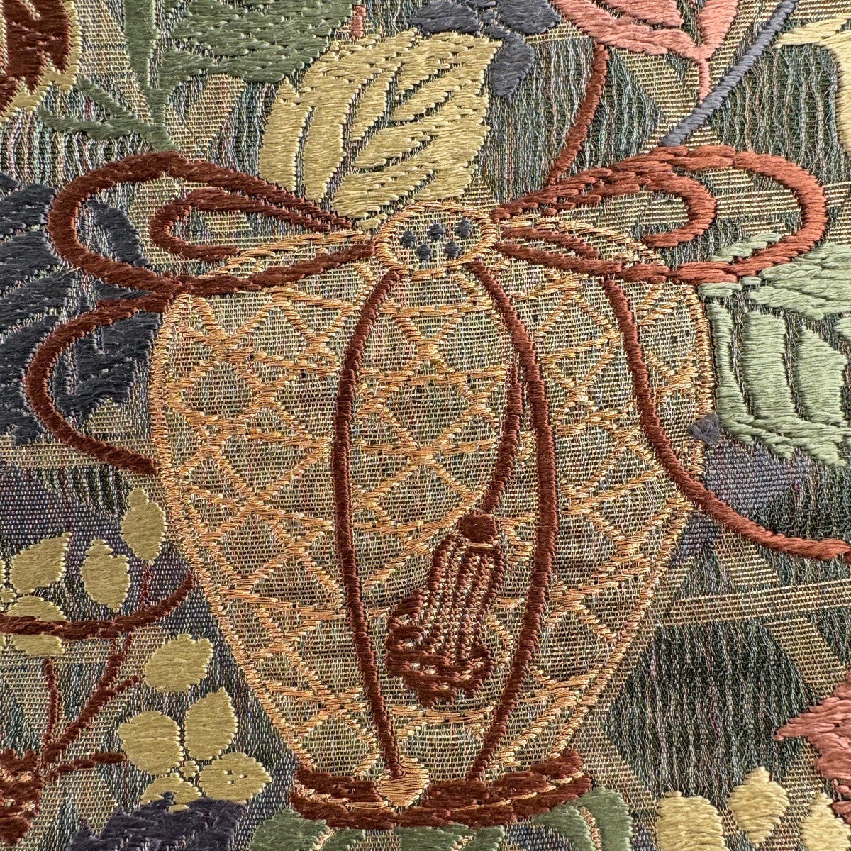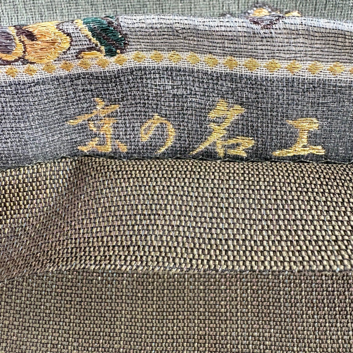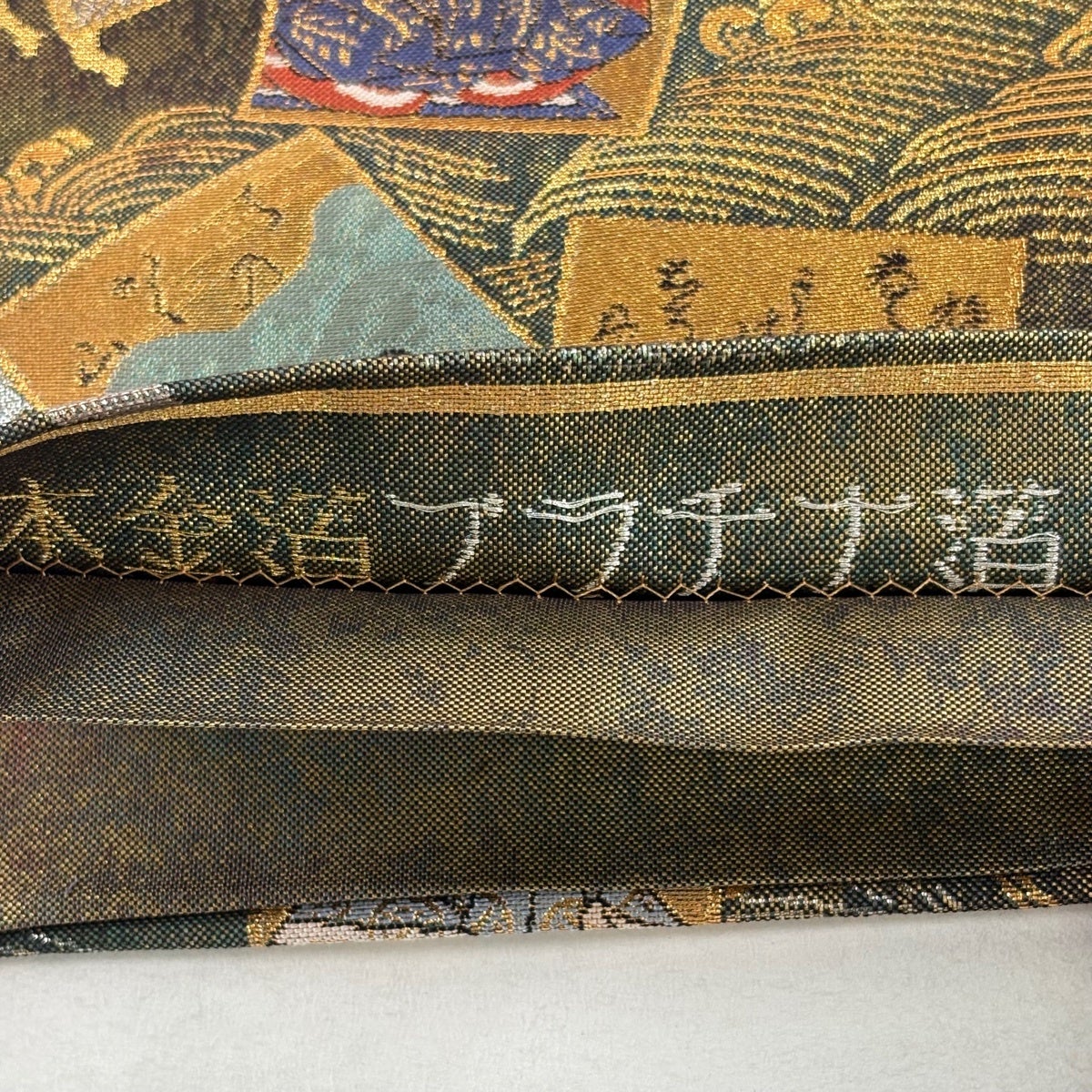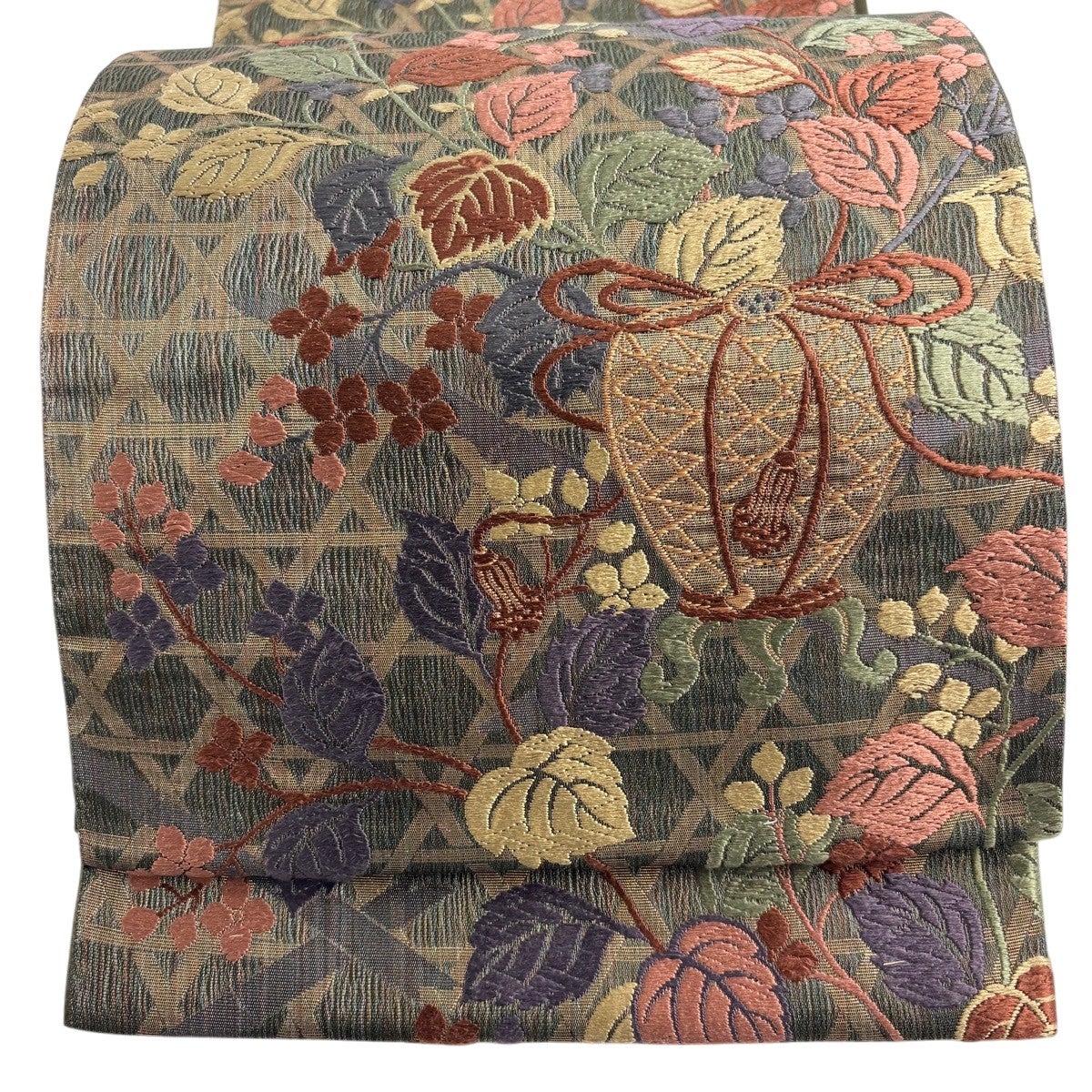 袋帯 名品 花井幸子 落款あり 草花 置物 唐織 箔 深緑 六通 正絹