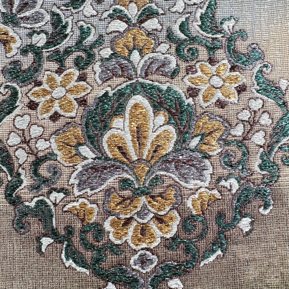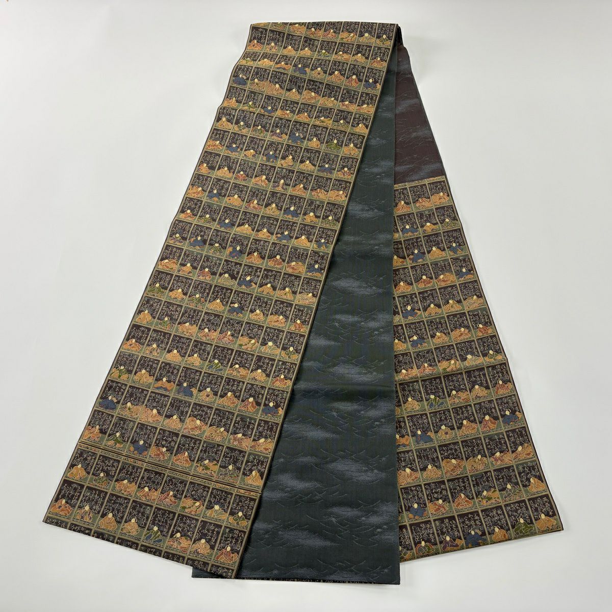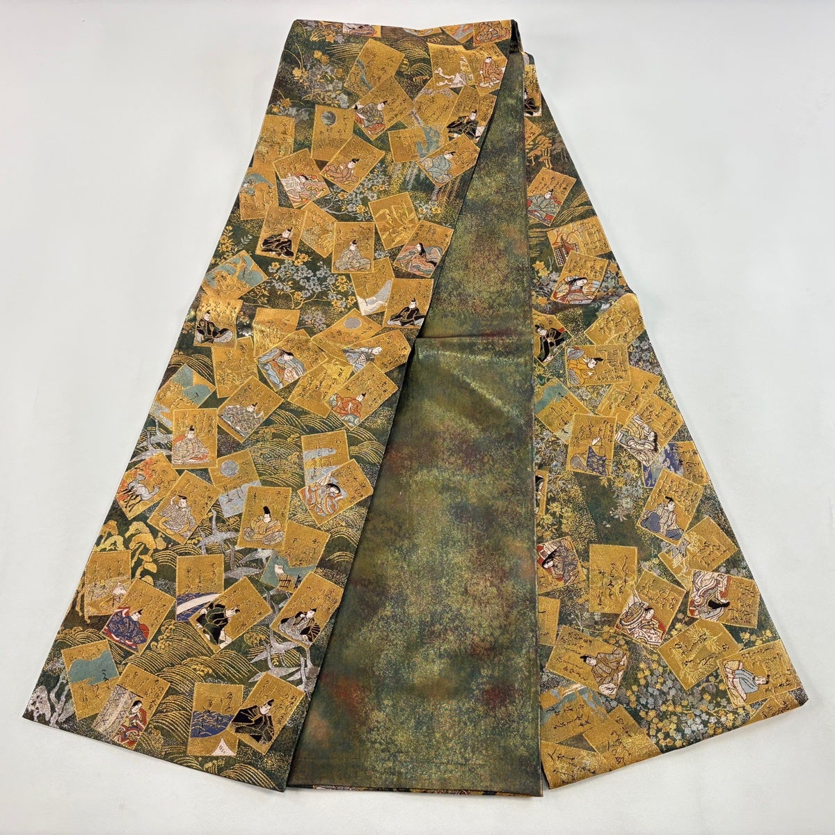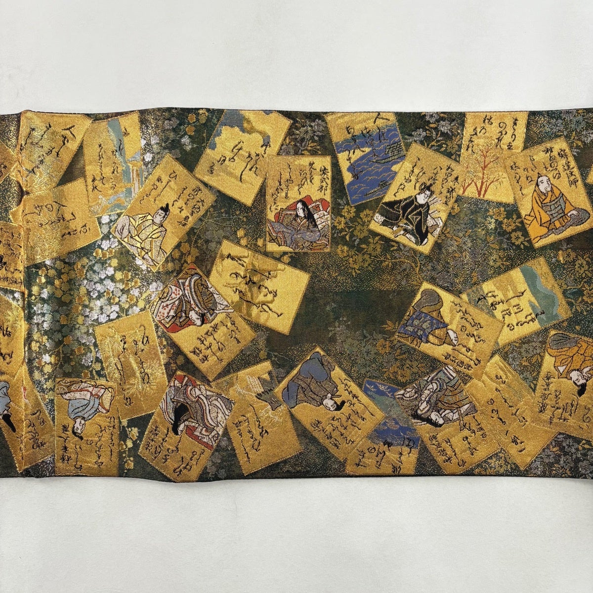 袋帯 名品 花井幸子 落款あり 草花 置物 唐織 箔 深緑 六通 正絹