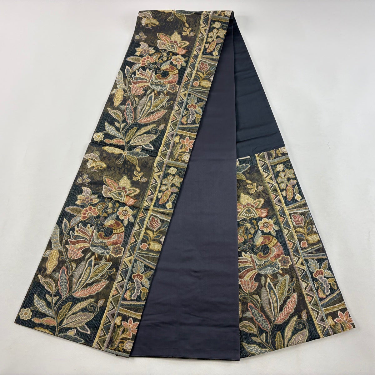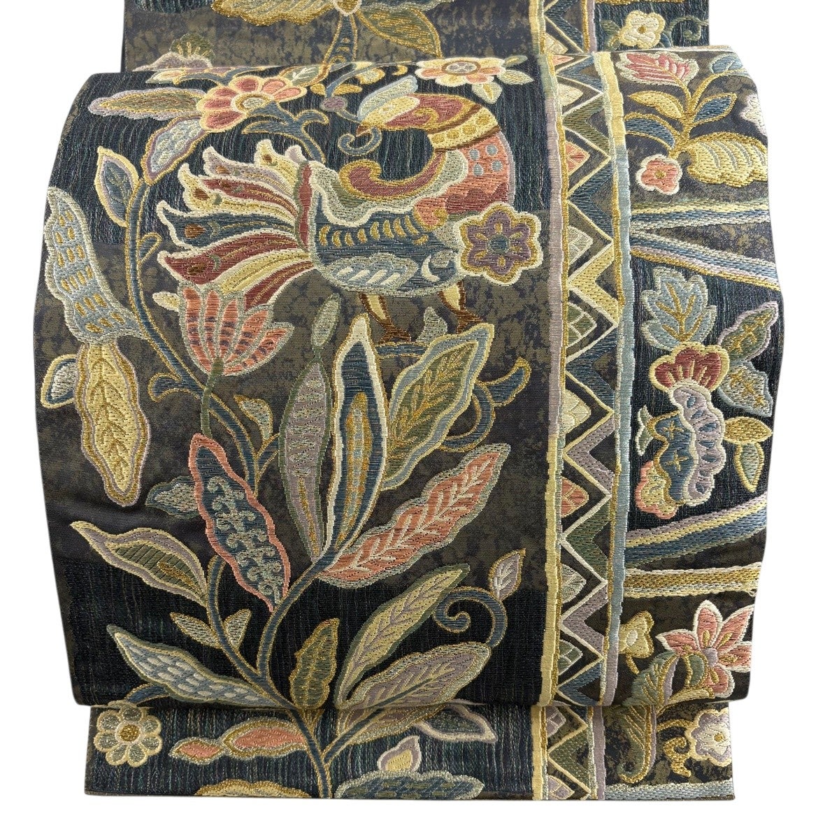 【美品】 袋帯 秀品 古布渡草華文 花喰い鳥 金銀糸 箔 深緑 六通 正絹