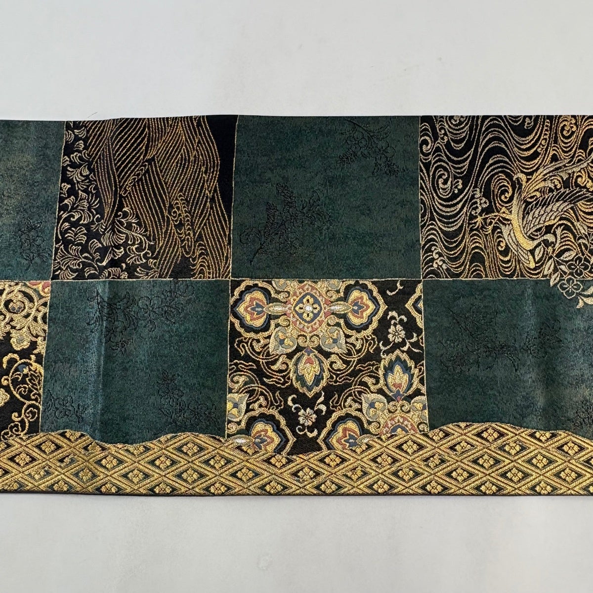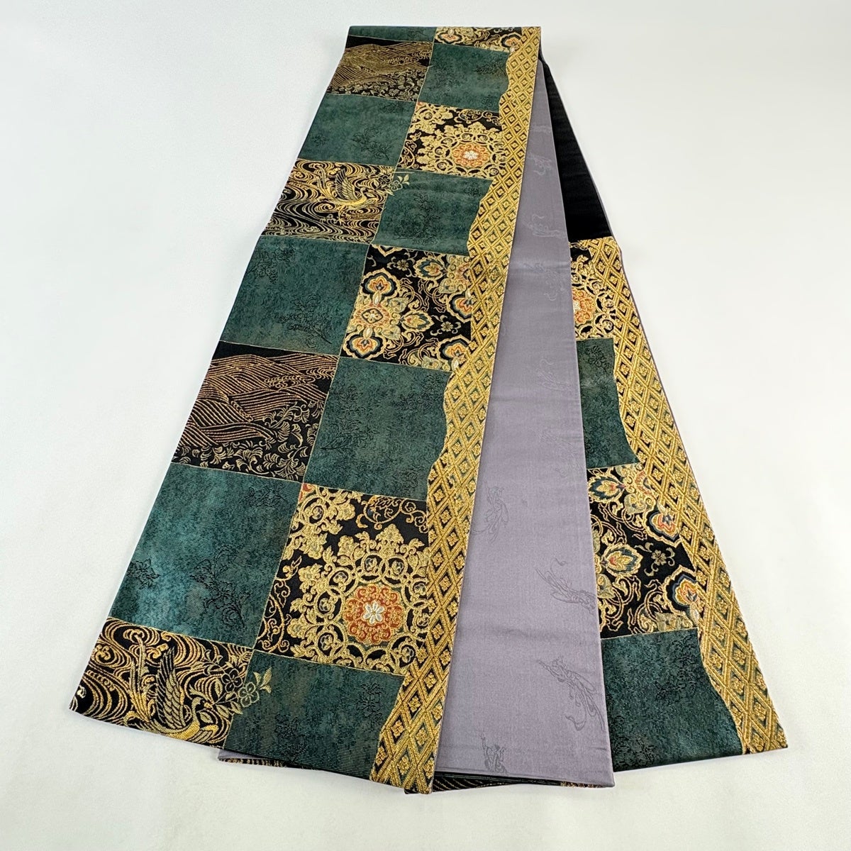 70%OFF 【美品】 袋帯 秀品 鈴乃屋 市松 深緑 六通 正絹 K70