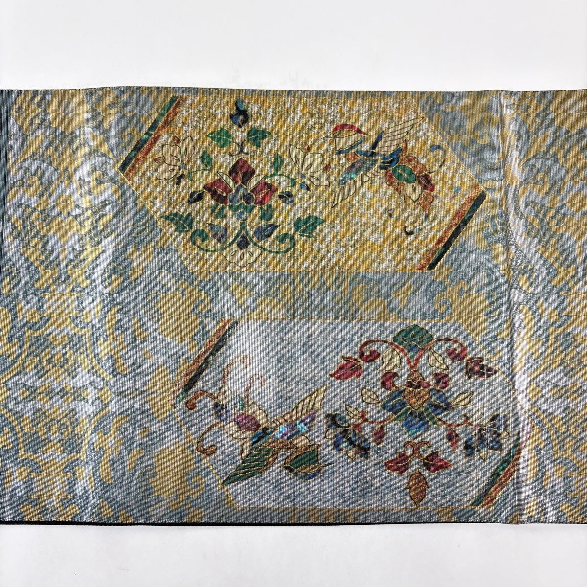 【美品】 袋帯 秀品 証紙あり 草花 鳥 螺鈿箔 箔 深緑 お太鼓柄 正絹