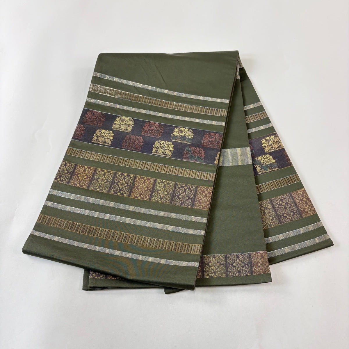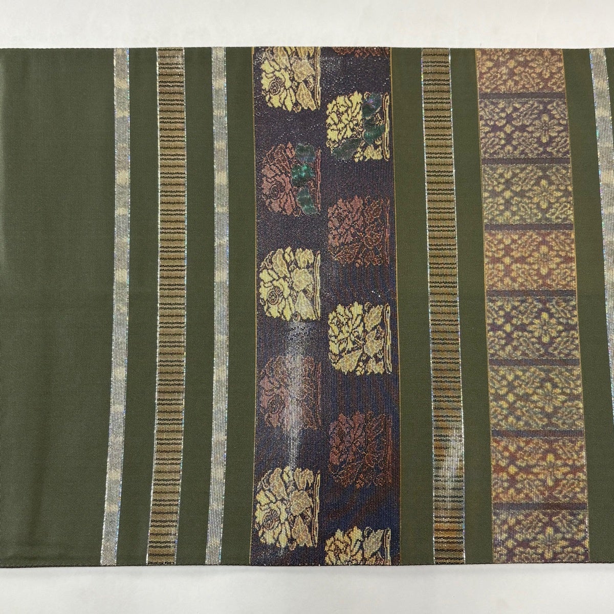 30%OFF 袋帯 秀品 枝花 縞 銀糸 深緑 お太鼓柄 正絹 K30